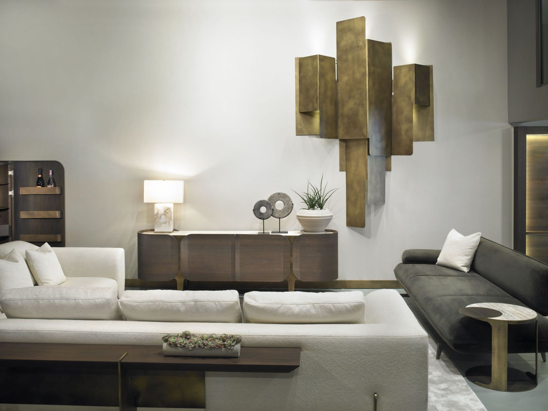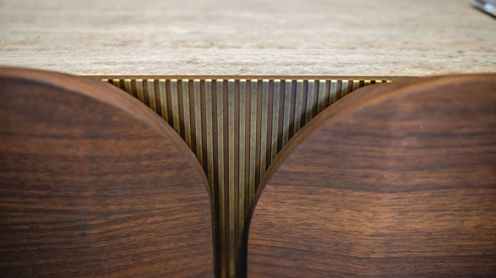 Die Ästhetik wird in den Armen der Natur geformt. Boji Sideboard, bei dem gealtertes Messing auf Travertinmarmor trifft, formt einzigartige Formen der Natur mit modernen Linien neu. Das Konzept der Ästhetik gewinnt eine neue Dimension in den mit Eukalyptus bedeckten Oberflächen, die mit LED-Beleuchtung bestickt sind.