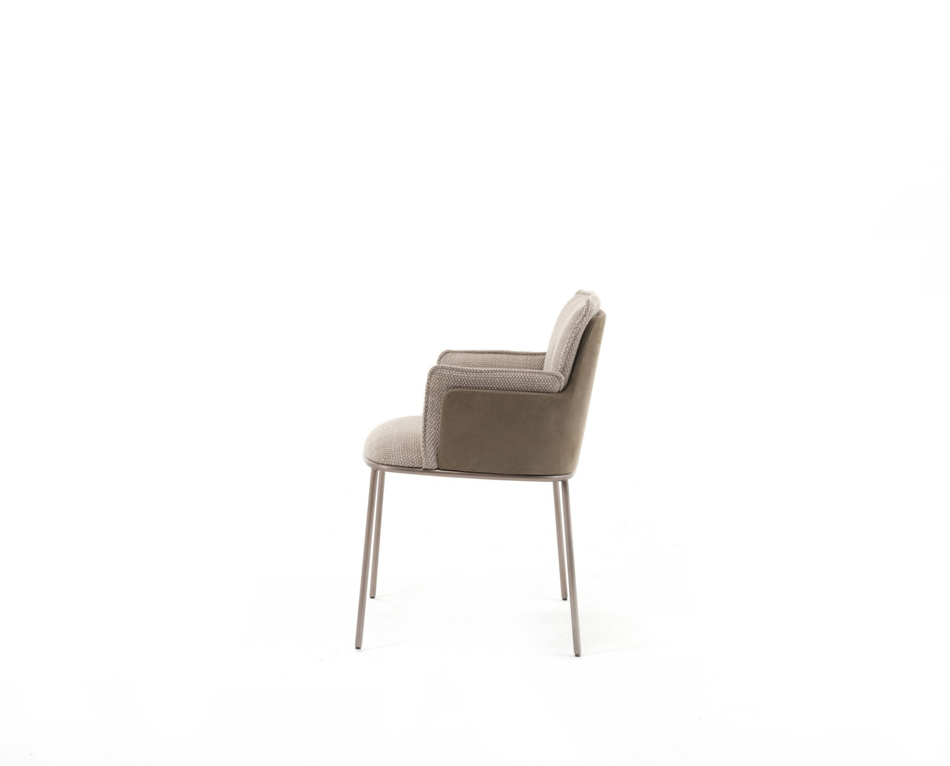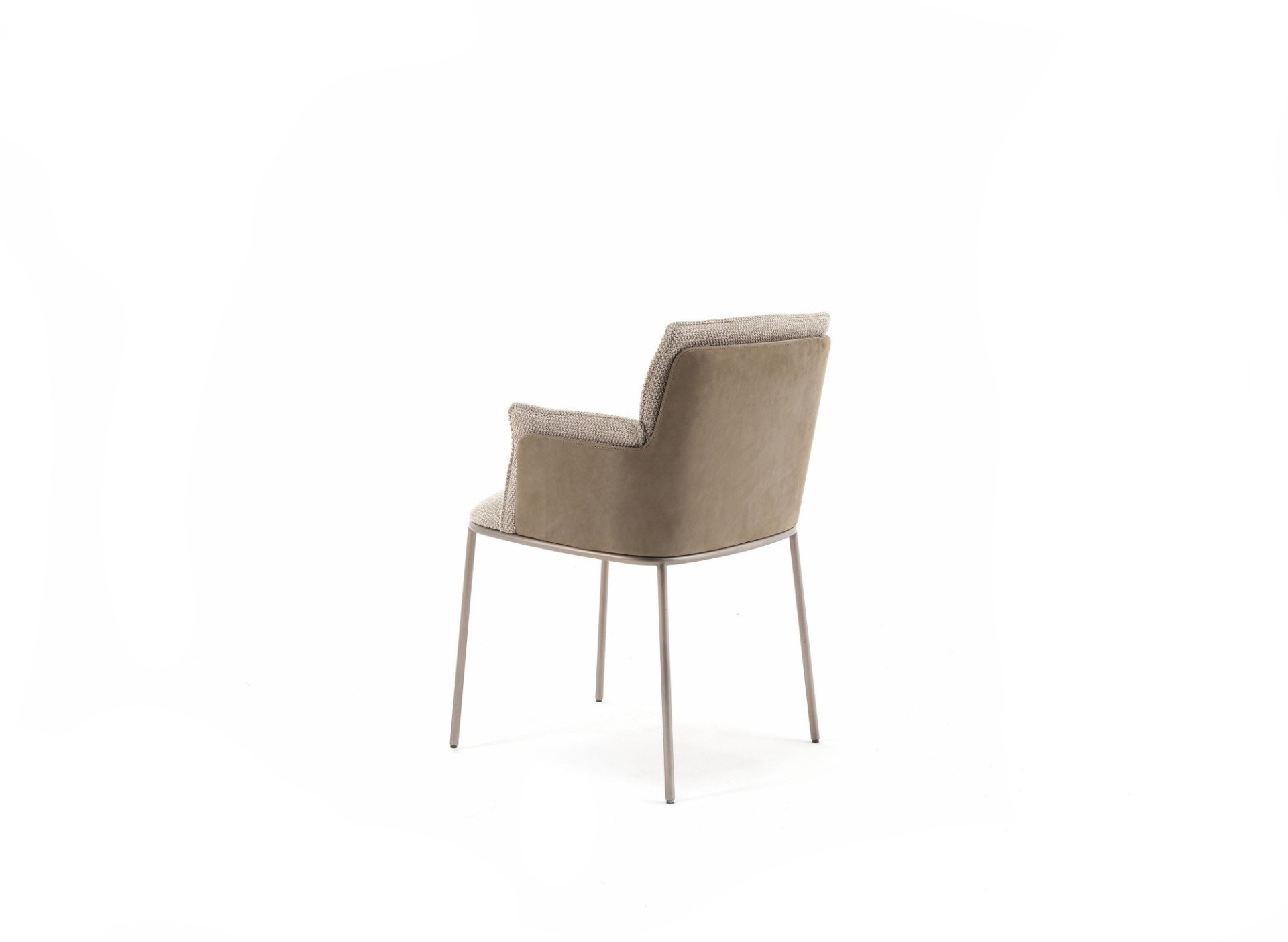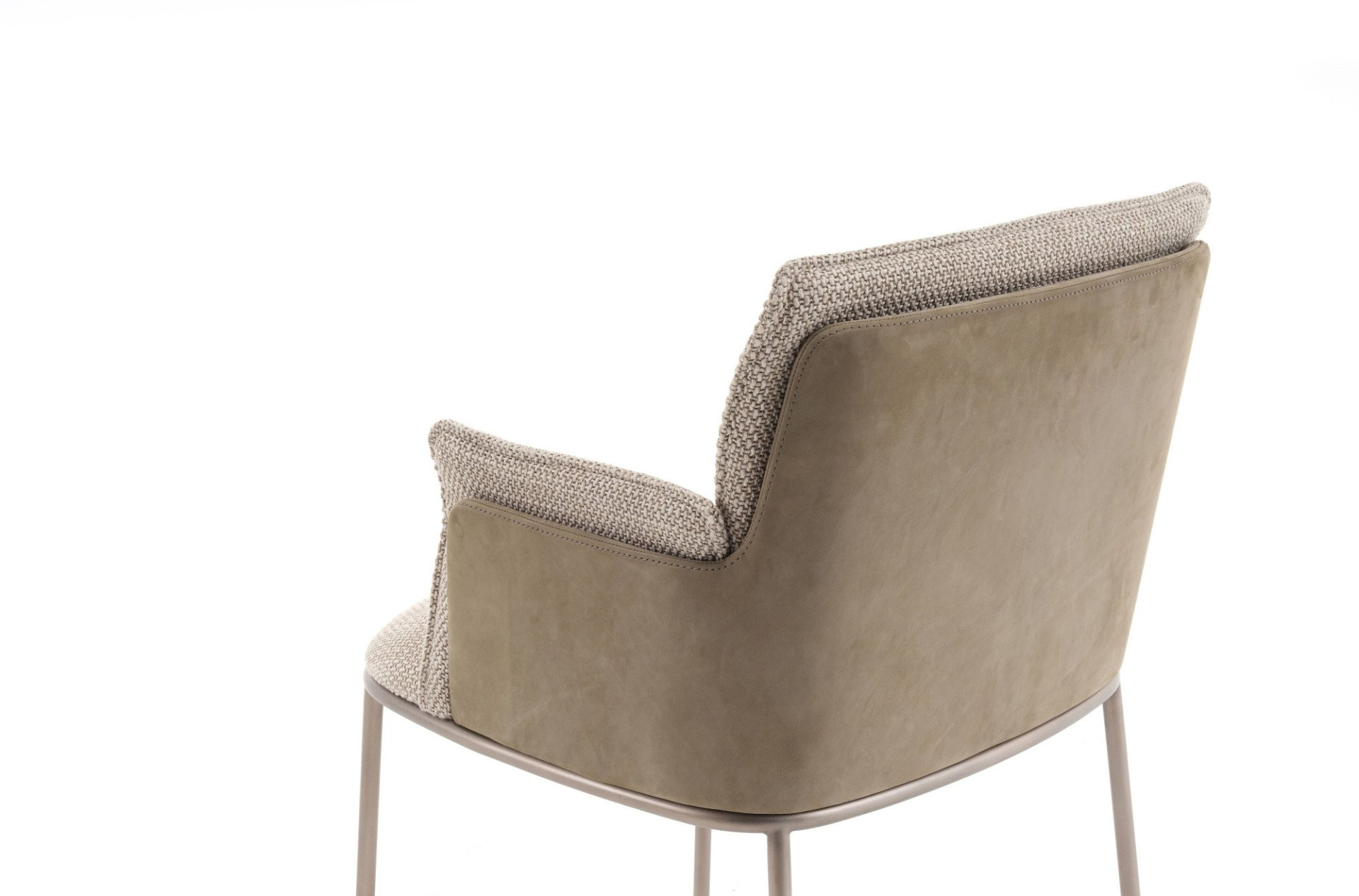 Der Cholet Chair ist eine Mischung aus femininen und maskulinen Zügen und hat eine eher schäbige, böhmische und lockere Ausstrahlung, die etwas unkonventionell für scharfe und angepasste zeitgenössische moderne Räume ist. Dieser entspannte Charakter macht ihn zur ersten Wahl für gemütliche, schicke Umgebungen. Die Rücken- und Armlehne besteht aus einem Metallgestell, das mit Nubuk oder Leder bezogen ist. Die gepolsterten Stoffsitze stehen auf dünnen Metallstäben. Der Designansatz sucht nach dem endlosen Kampf zwischen weichen und harten, organischen und starren Formen. Mit dem Cholet Chair findet dieser Kampf ein Ende, und die beiden unterstützen sich schließlich gegenseitig. Das Produkt ist abrupt und magnetisch und hat eine sinnliche Anziehungskraft, wobei die Kissen die Kanten der Metallschale überlagern. Es sind Optionen aus Stoff, Leder und Nubuk erhältlich. Die Metallbeine und die Verkleidung des Sitzes sind in drei Farbtönen erhältlich. Der Stuhl wird vor allem in Heimbüros und Esszimmern eingesetzt und eignet sich hervorragend für Wohn- und Gaststättenprojekte.