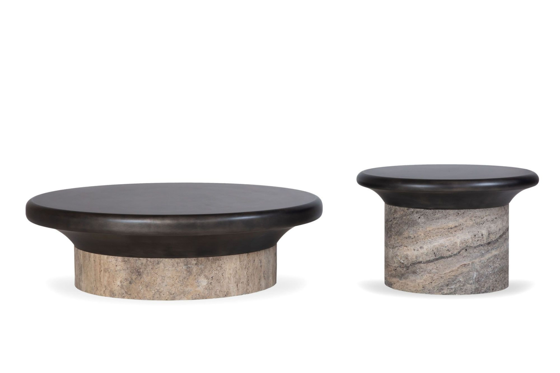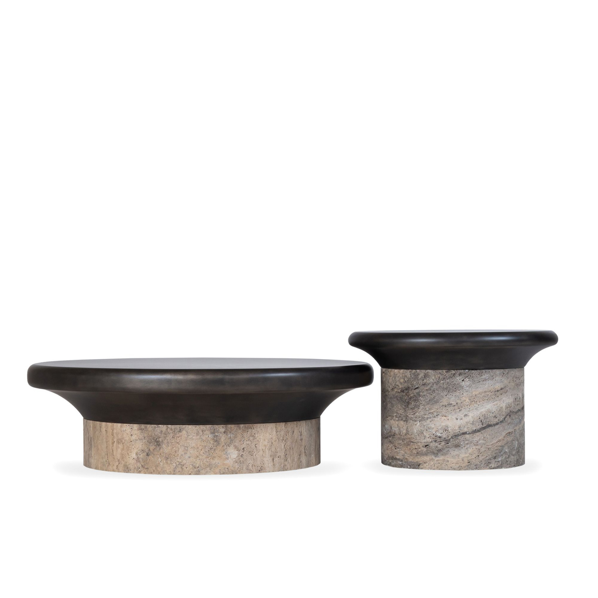 In Anlehnung an die kühnen, majestätischen Linien und die würdevolle Präsenz der Suspence-Sitzmöbel ist der Suspence-Couchtisch in zwei Größen erhältlich und ergänzt die moderne, avantgardistische Aura der Szene. Der ausgehöhlte Fuß aus Naturstein ist mit versteckten Rollen ausgestattet und neben zahlreichen Marmorvarianten auch in lokal hergestelltem Travertin erhältlich. Die metallisch lackierte Holzplatte ist in zwei kontrastierenden Farben erhältlich.