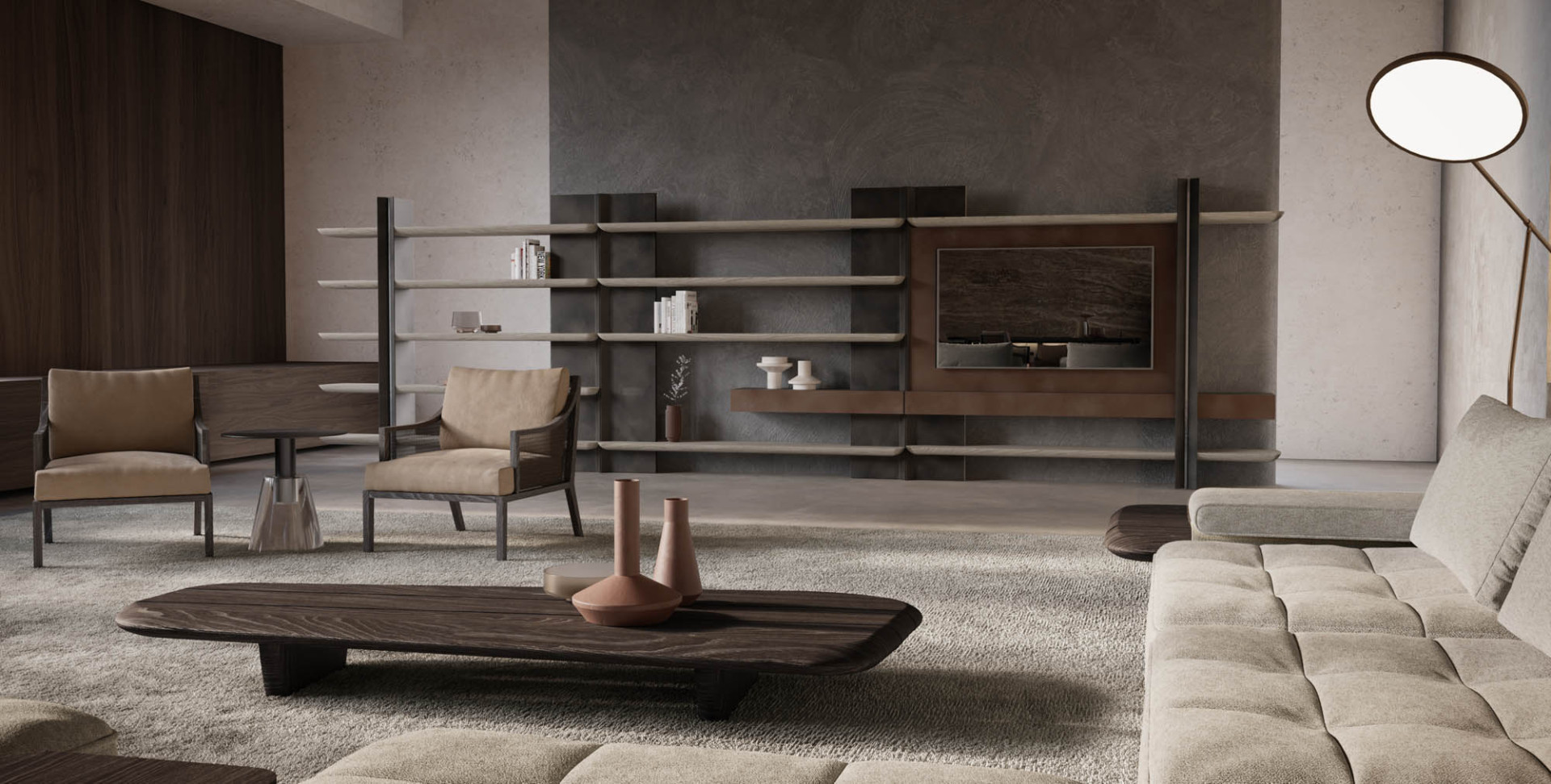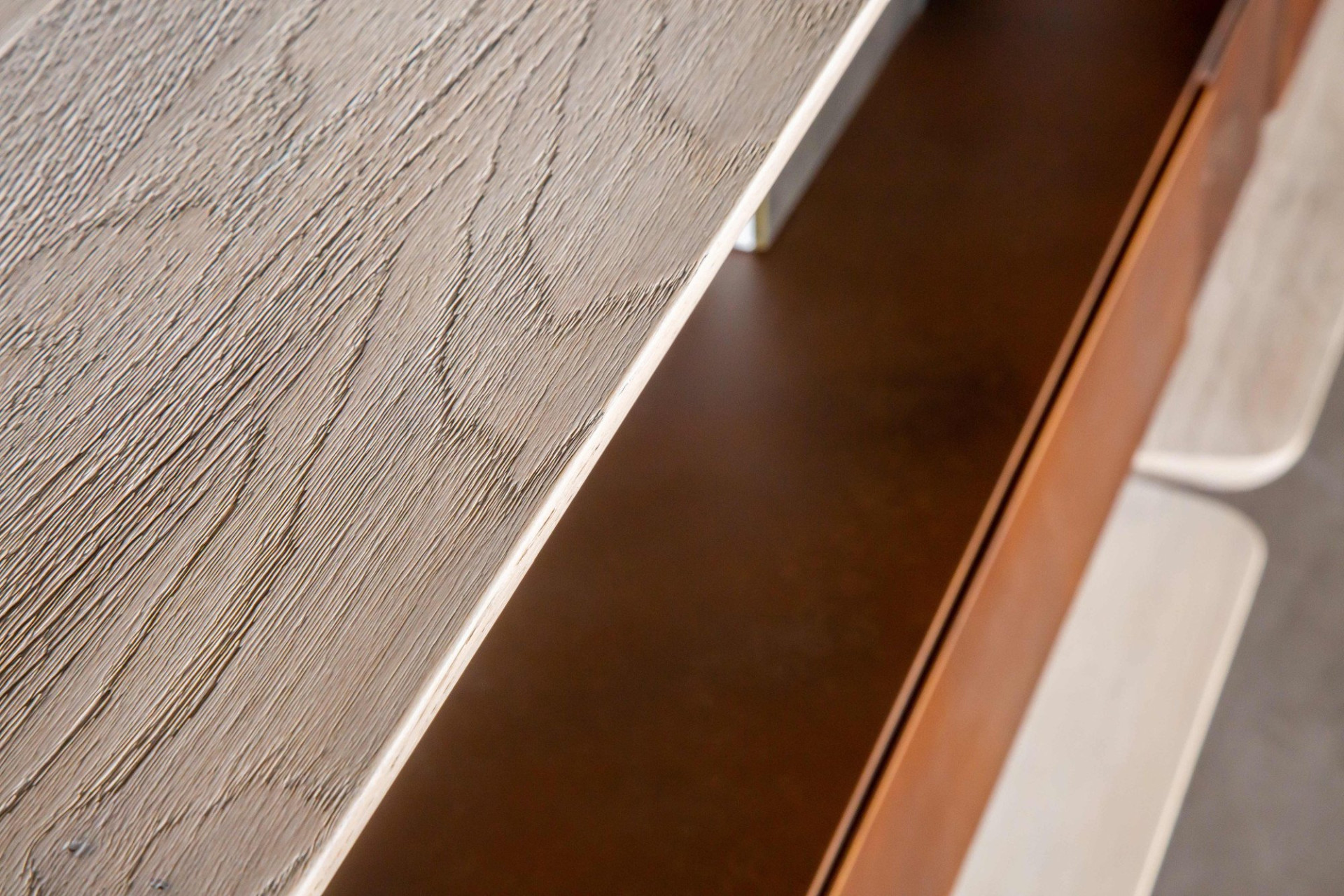 Das mit einer Rückwand aus furniertem Holz und schwebenden Schubladenmodulen ausgestattete Discovery TV Unit ist eine illustrierte Version des Discovery Bookshelf, das mit seinen voluminösen geschliffenen Massivholzböden für Aufsehen sorgt. Die furnierten Holzelemente sind auch in Metallic- oder Lackausführung erhältlich, die Metallpfosten in gebürsteter Ausführung für zusätzliche Textur, und die große Auswahl an Farbtönen ermöglicht zahlreiche individuelle Konfigurationen und Lösungen.