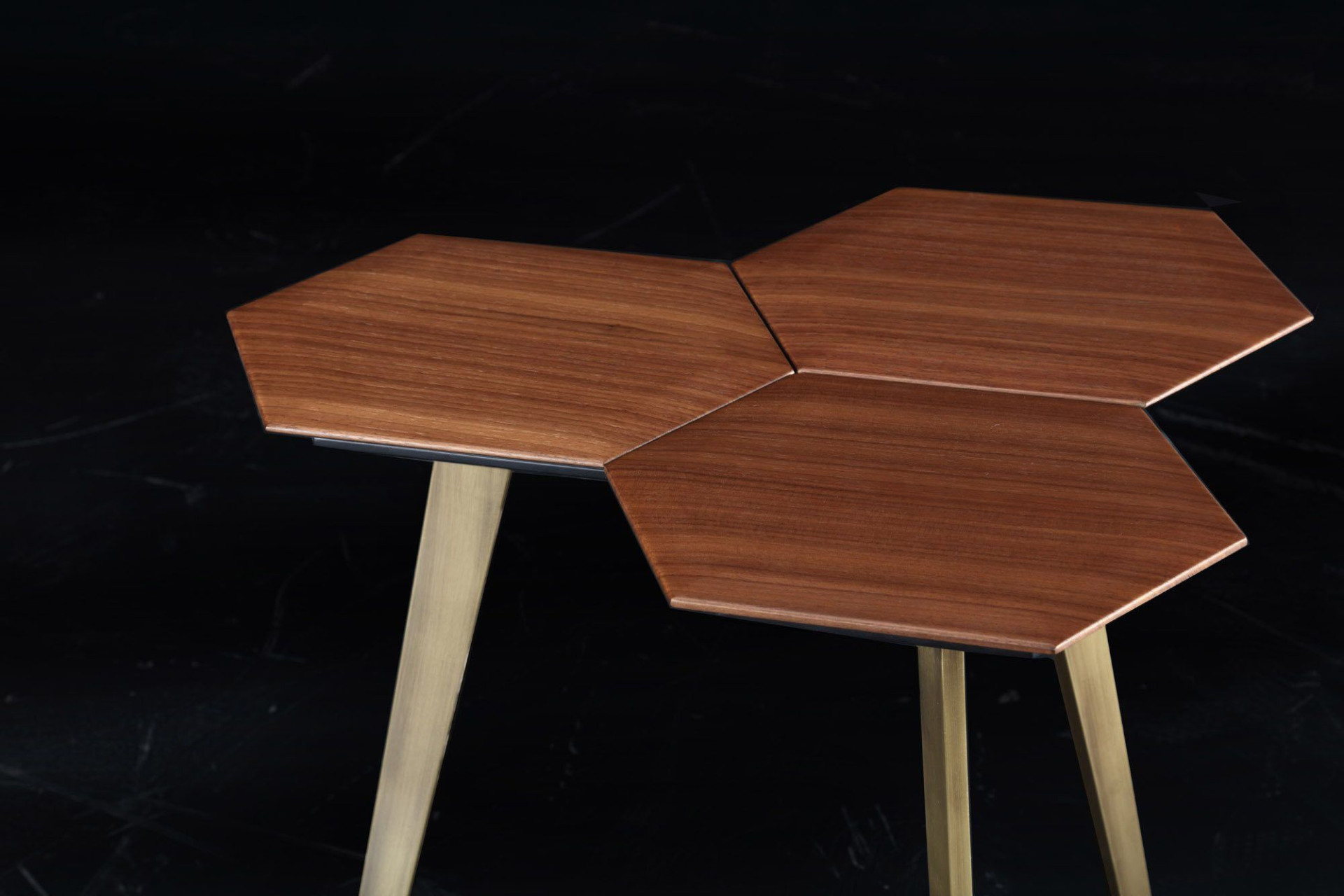 Wenn die reine Geometrie das Designfeld umgibt, entsteht Icy-A, ein atypischer Couchtisch, der auf überraschende Weise mit Volumen und Formen spielt. Er mischt sehr subtil die Materialien, das Holz und das Metall, um die matte Oberfläche des Holzes zu enthüllen, die den Glanz eines glänzenden Messingmetalls überlappt. Verrückt elegant, intelligent und zeitgemäß.
