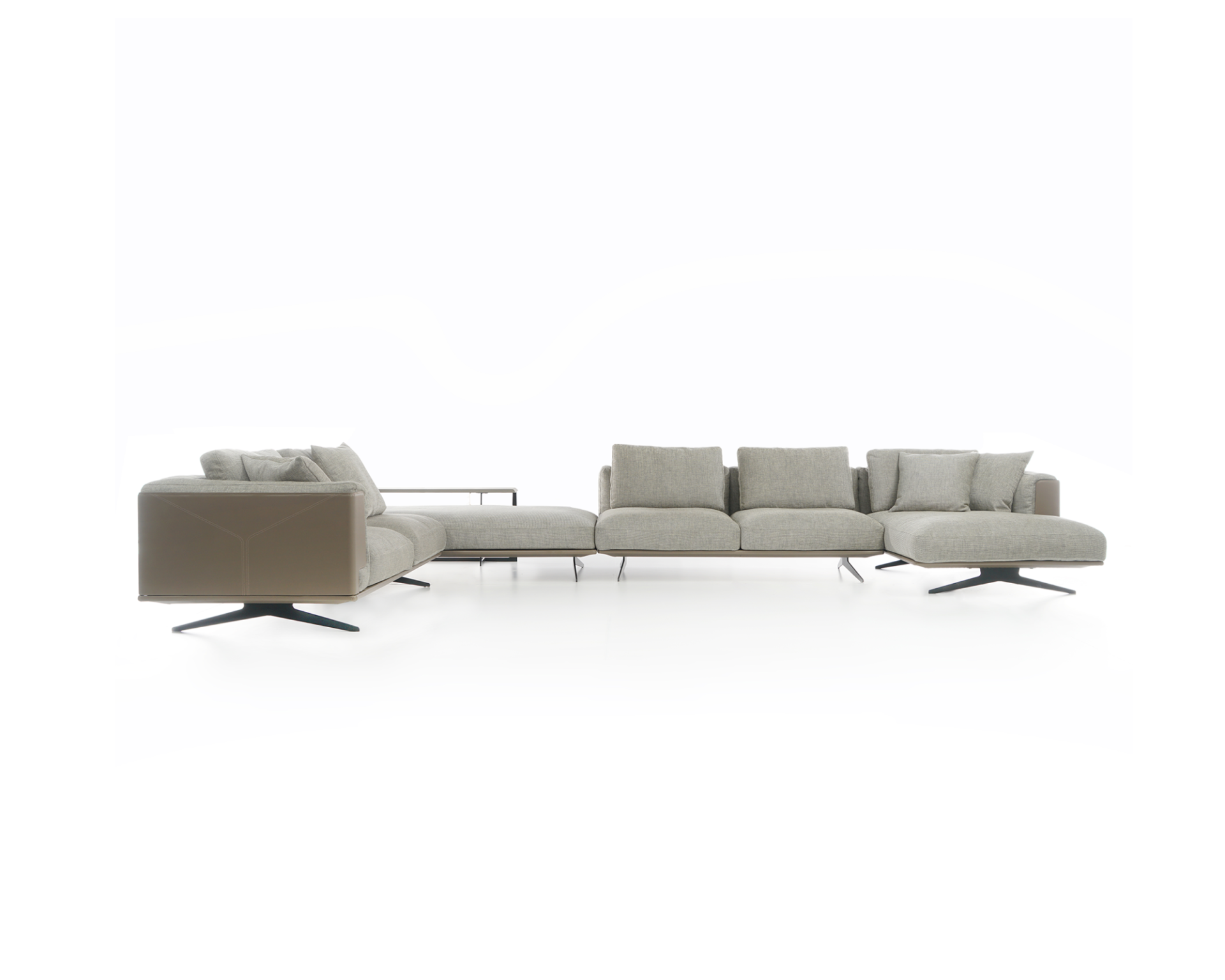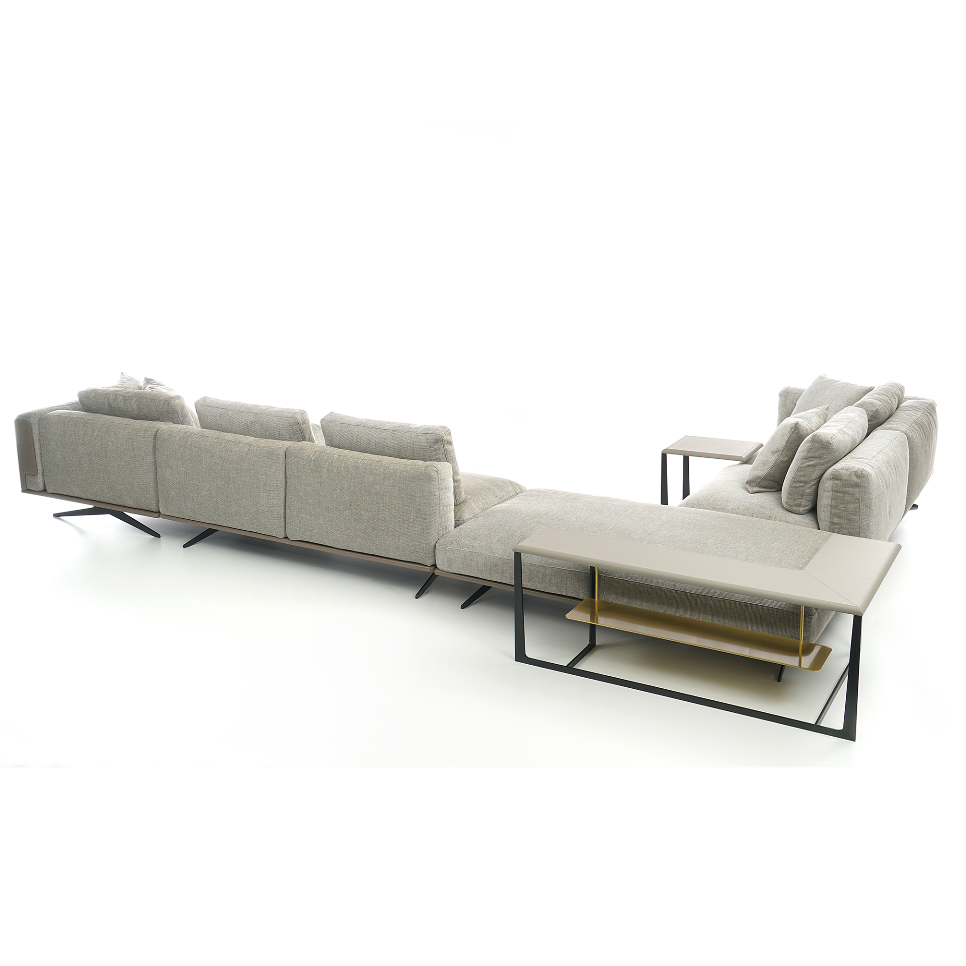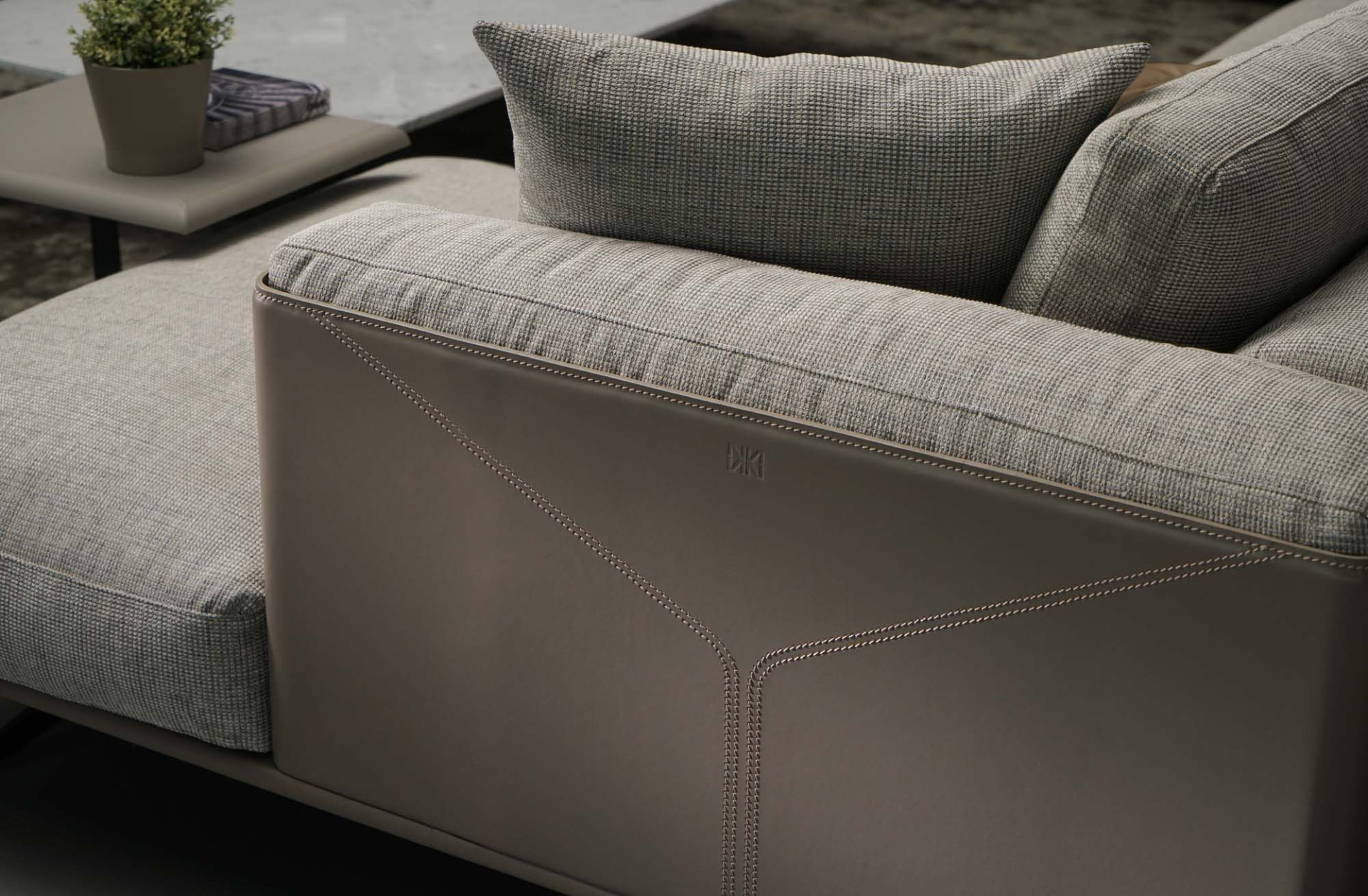 Der exquisite Sofakorpus wird durch einen Rahmen aus Hartleder definiert, der sich über das gesamte Möbelstück erstreckt und die Armlehnen umhüllt, was ihm eine ästhetische Wärme und unverwechselbare Details an den Armlehnen verleiht. Das Imperious ist mit metallischen V-förmigen Beinen ausgestattet, die den Sofakörper schweben lassen und ihm eine leichte Ästhetik verleihen. Der kaiserliche Komfort des Sofas Imperious macht es zum perfekten Möbelstück für das tägliche Leben.
