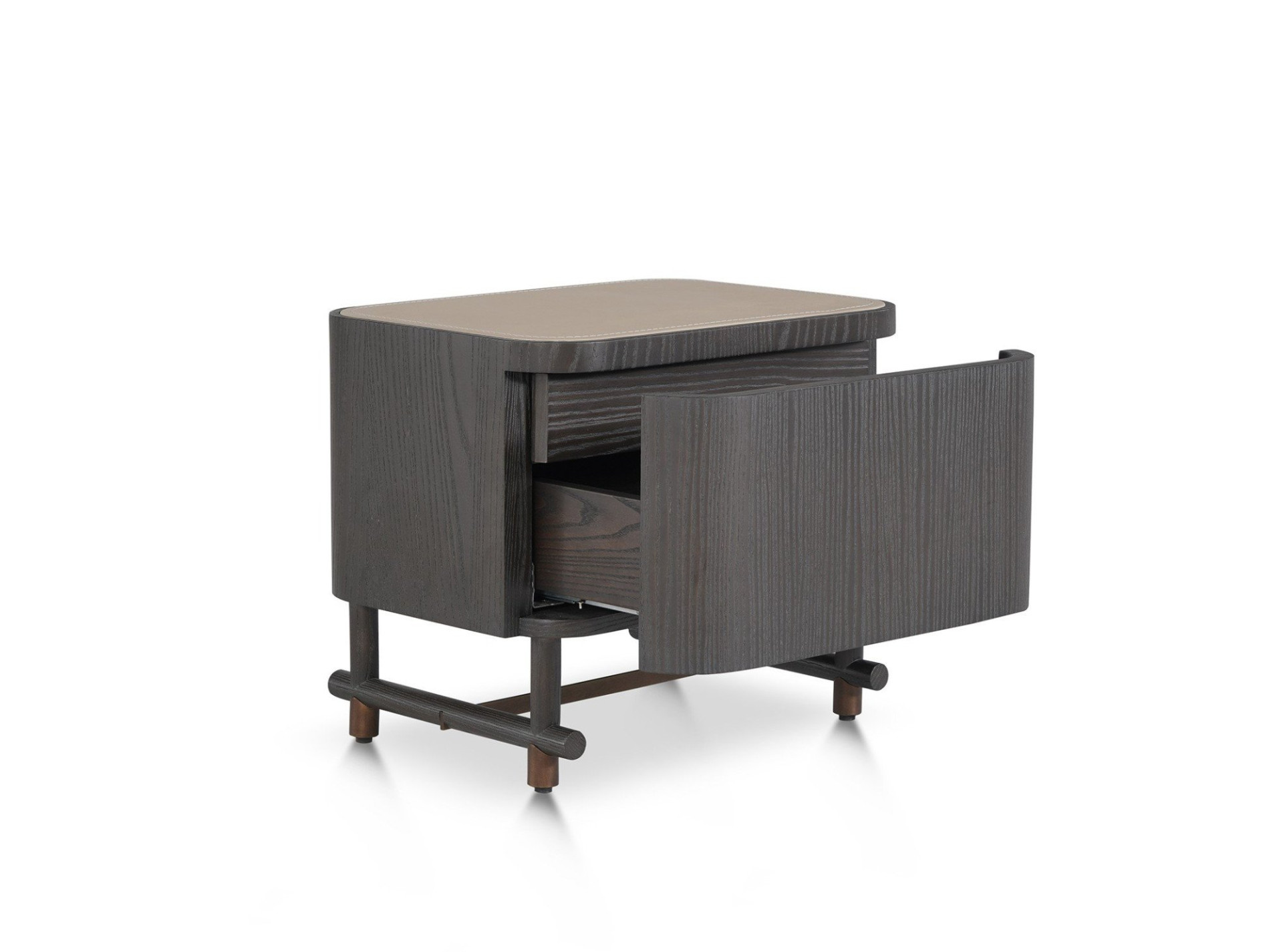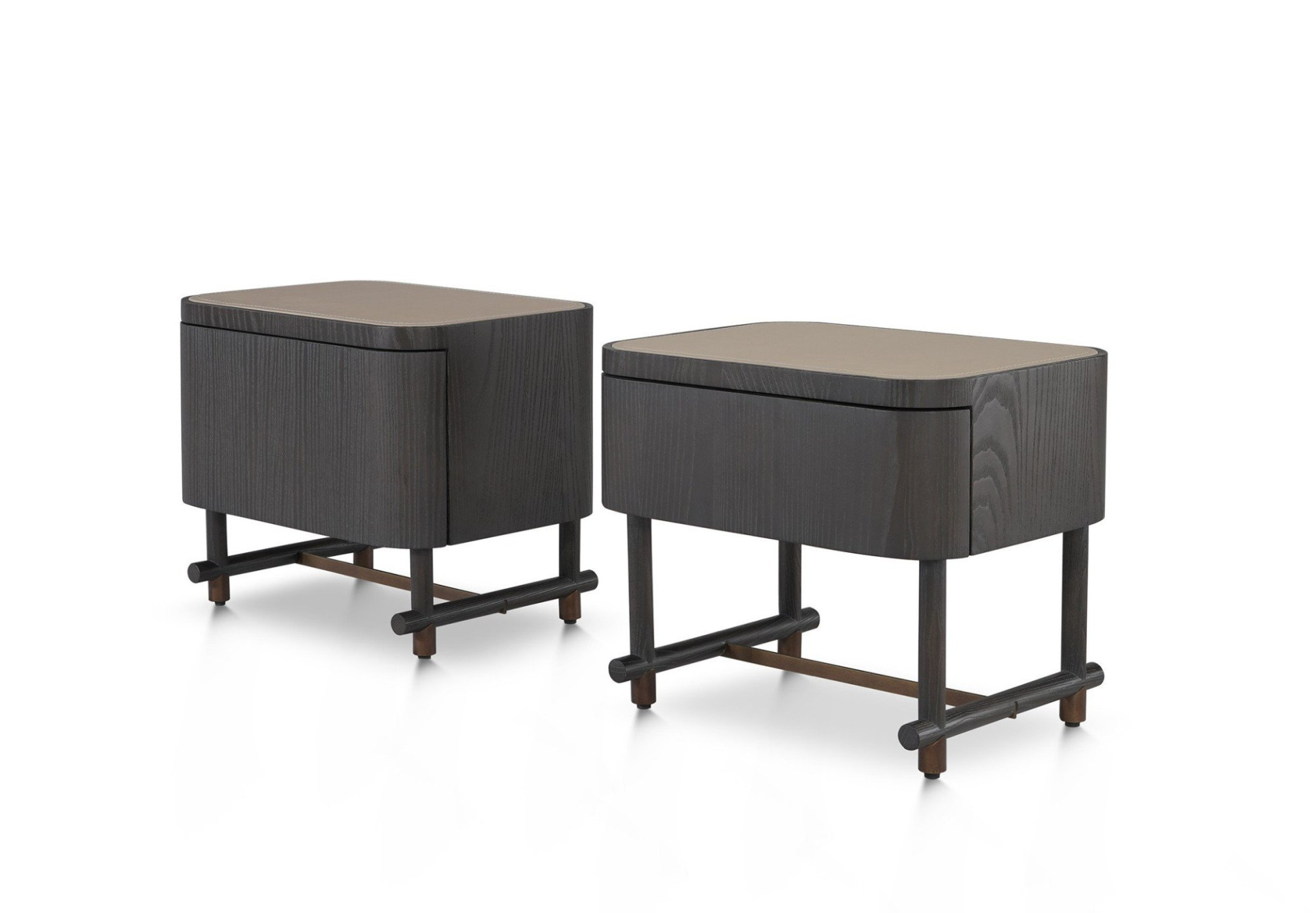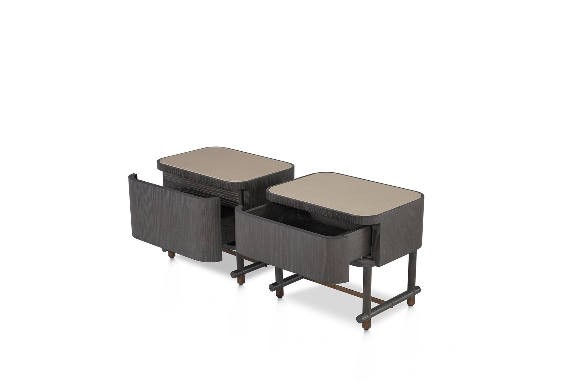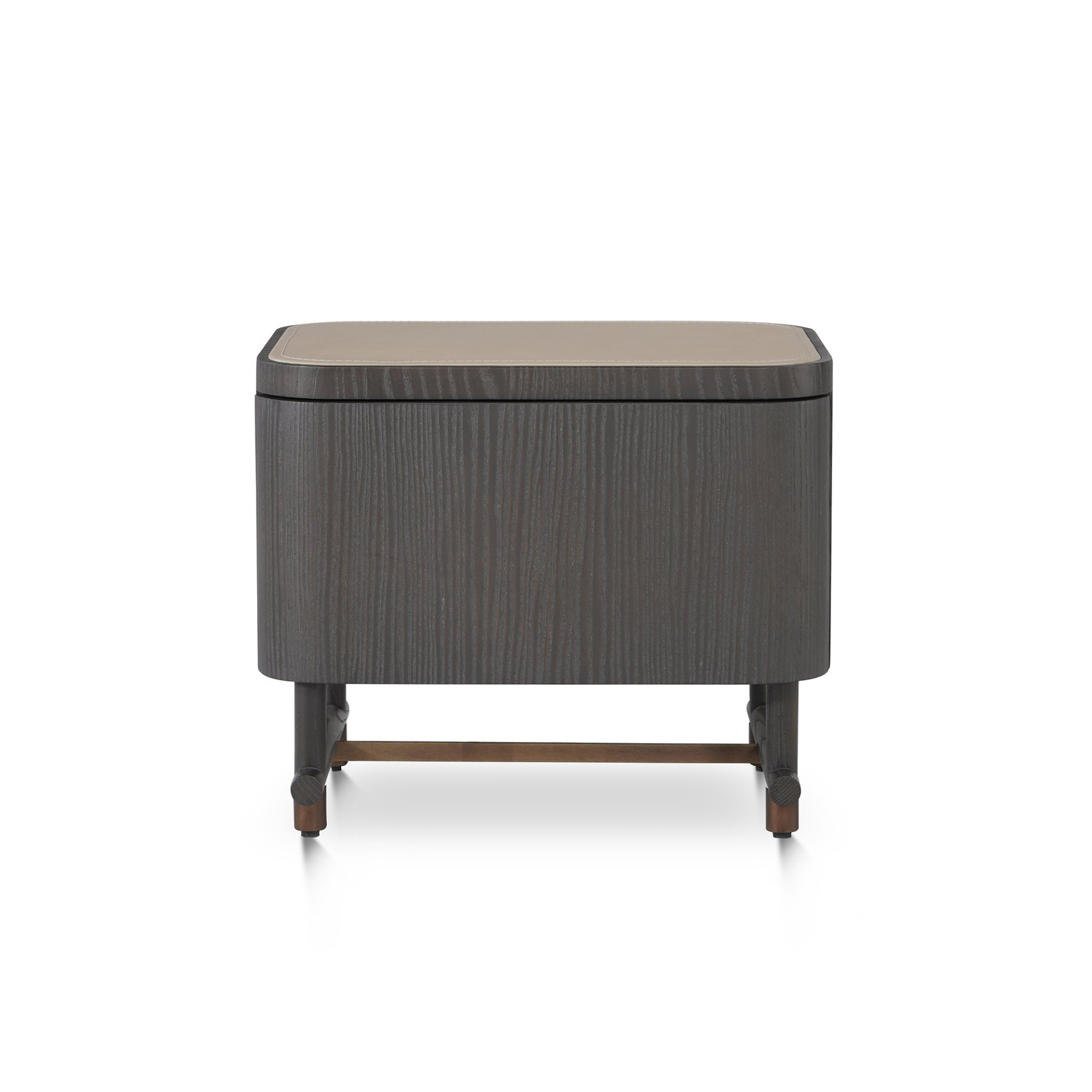 Die Kimono-Nachttische gibt es in zwei verschiedenen Größen, wobei der größere Behälter eine zusätzliche Schublade beherbergt. Leder- oder Nubukbeschichtungen überziehen die oberen Schichten der holzfurnierten Kästen, und zusätzliche Details an den Metallbeinen verleihen dem Design Opulenz. Leder-, Holz- und Metallelemente sind in verschiedenen Farben und Texturen erhältlich.