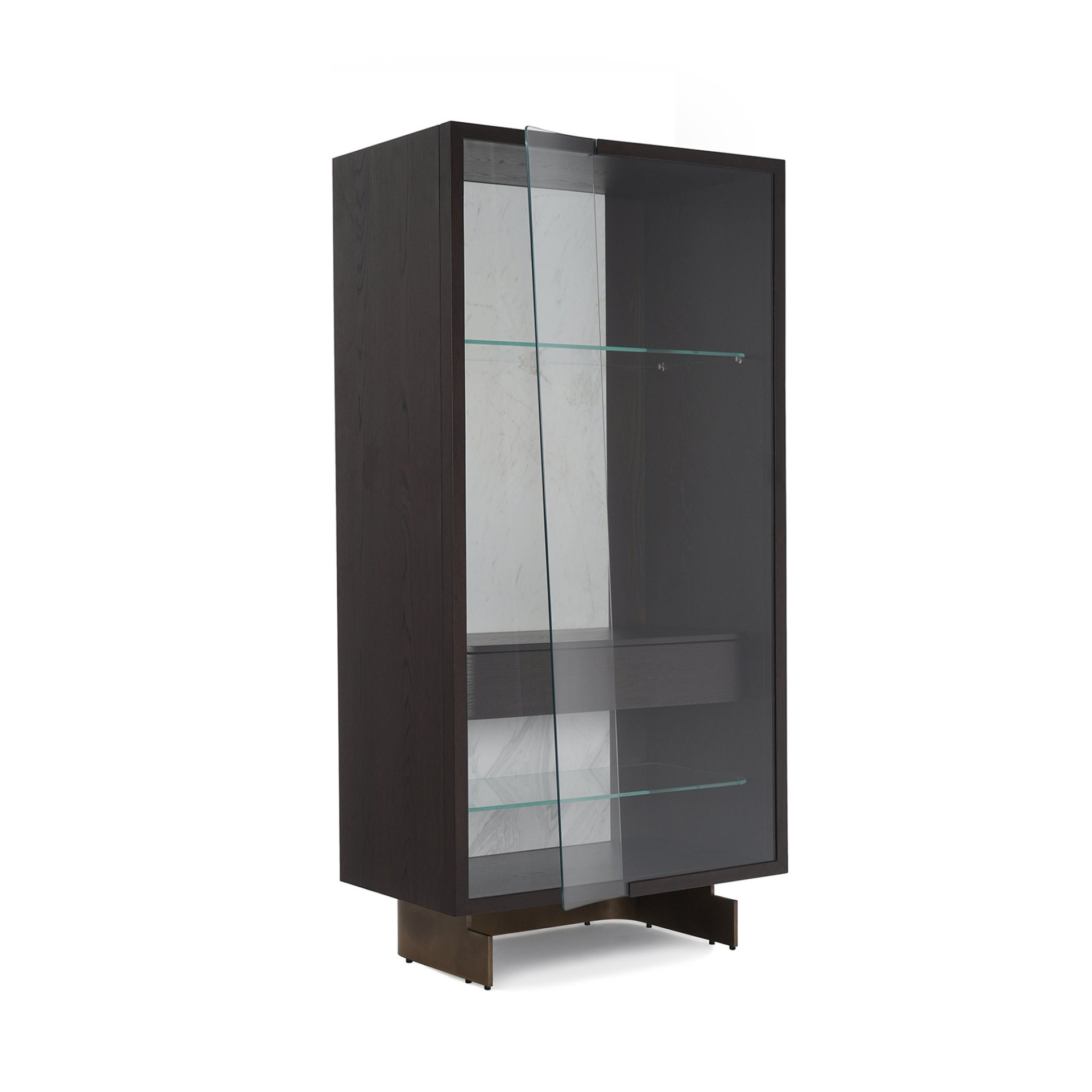 In Harmonie mit den anderen Mitgliedern der Kollektion hebt sich Leaf Showcase durch die fast unmöglichen Kurven seiner klaren Glastüren ab, die von den renommierten Glasmachern von Istanbul hergestellt werden, einer Stadt, die für ihre dreihundertjährige Tradition der Glaskunst bekannt ist. Die rechteckige Vitrine ist mit Glasböden und einer Holzschublade ausgestattet und in zwei verschiedenen Regalformen erhältlich. Mit ihrem LED-beleuchteten Innenraum aus Marmor und Holzfurnier dient die Vitrine als Schrein für persönliche Schätze und bildet einen glanzvollen Hintergrund für jede Möbelkombination. Die schlanken Metallbeine heben das Möbel auf und verstärken den massiven Charakter des Designs.