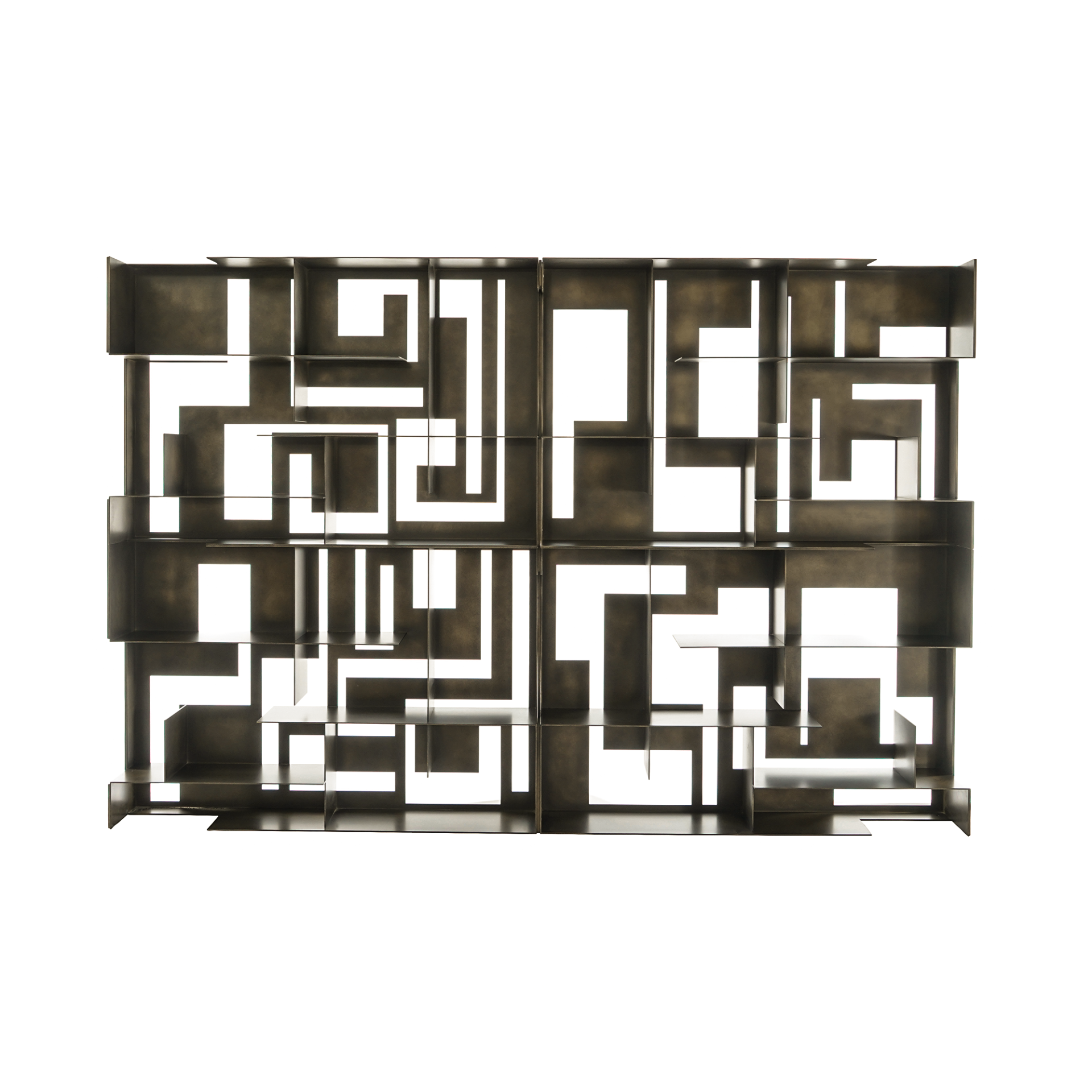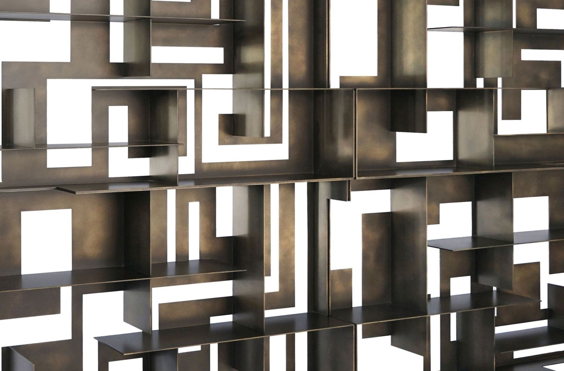 Die Formel der Perfektion liegt im Detail verborgen. Materia Library kombiniert gealtertes Messing und farbiges Aluminium in asymmetrischen Linien und präsentiert die wertvollsten Gegenstände Ihres Hauses in einem perfekten Design.