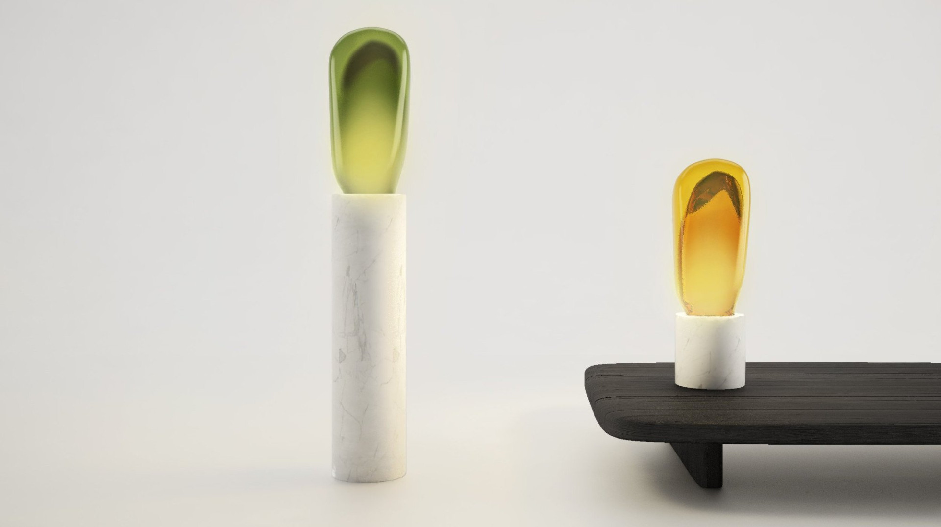 Um 50 v. Chr. entdeckten Glasmacher aus dem östlichen Mittelmeerraum die Technik des Mundblasens und verbreiteten sie in Anatolien, um dieser Kunst zum Erfolg zu verhelfen. Seitdem hat sich nicht viel geändert; die anatolischen Glasmacher gehören zu den Besten ihres Fachs. OPHELIA ist ein zeitgenössisches Qualitätsprodukt, das von einheimischen Kunsthandwerkern hergestellt wird. Es handelt sich um ein hochwertiges Beleuchtungsset aus mundgeblasenem, getöntem Glas. Die ausgehöhlten Marmorsäulen sind in zwei verschiedenen Höhen erhältlich, um die Funktionalität der Tischleuchte auf eine Stehleuchte zu erweitern. Das Design besticht durch seine stark abstrahierten, kühnen Linien und passt sich so imposanten Interieurs an. Erhältlich in fünf Farben: Senf, Blau, Rauchgrau, Grün und Bernstein.