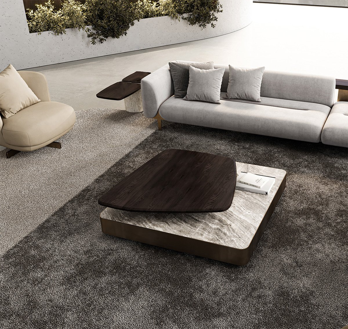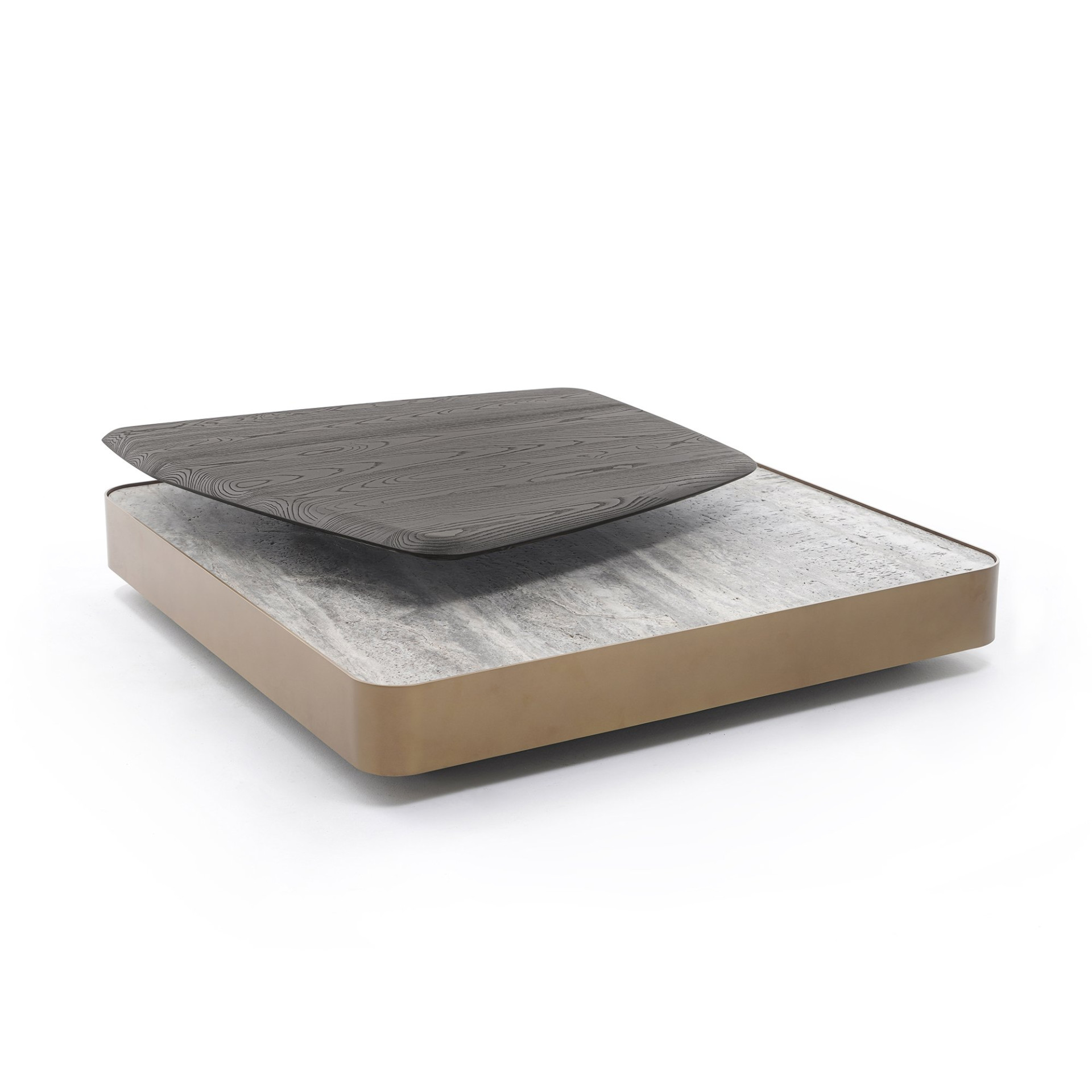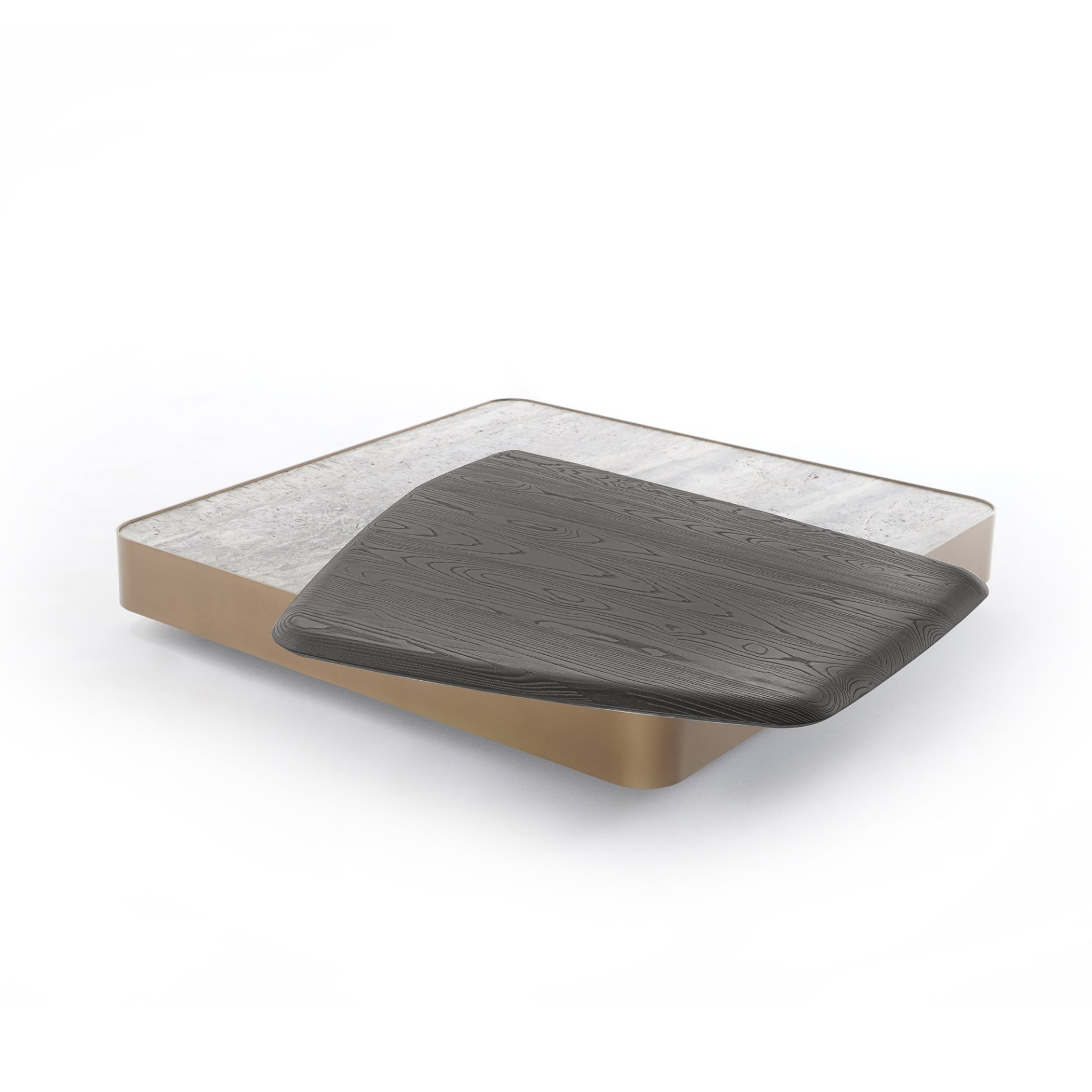 With a focus on durability, roots, and a neutral color scheme for an overall calming effect, ROTATE COFFEE TABLE, constitutes three different natural materials attentively handled with the codes of Zen minimalism: stone, metal, and wood. Balance is the primary concept of the design, characterized by the decentered pivoting junction of the amorphous solid wood top. This revolving platform is the core element of the unit, hollowed out to keep the balance intact, and flexibility shows itself in the option of creating dynamic compositions through this piece. A sleek metal sheet encircles the stone slab that rests on a hidden base and highlights the floating effect. The stone table top is either travertine or marble, with plenty of color and texture options, and is interchangeable with fused glass. The sanded solid wood and metal surfaces have numerous color alternatives.