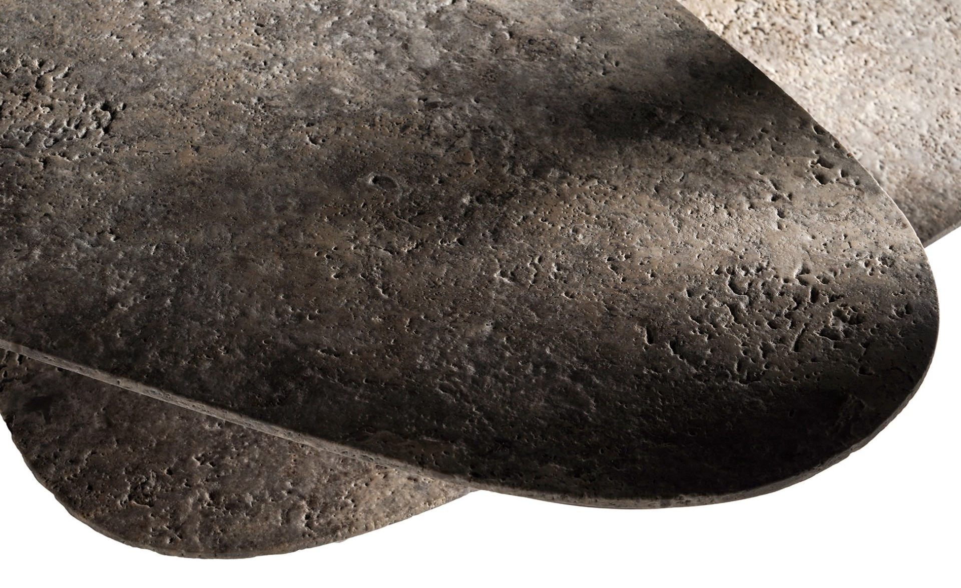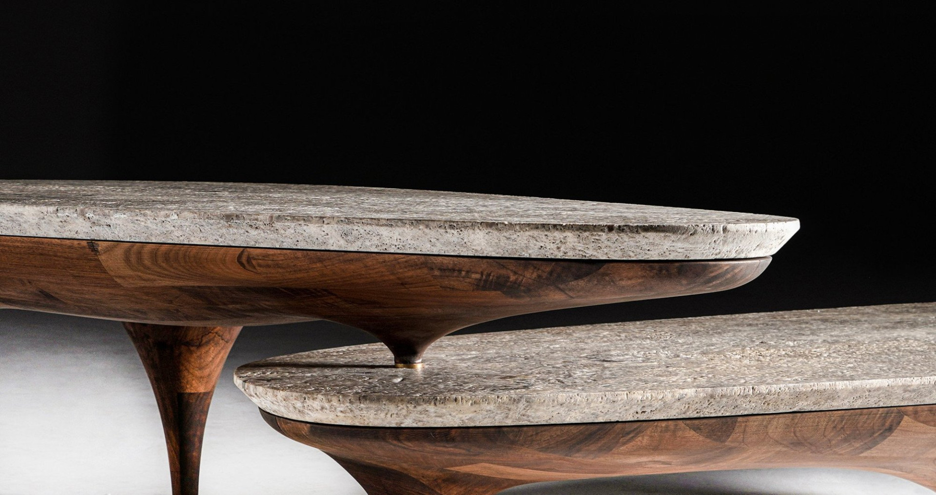 "Tabaka" besteht aus einem Satz von mindestens zwei Tischen. Während der untere Tisch freistehend ist, wird der zweite Tisch über einen einzigen Drehpunkt aufgesetzt. Die Anzahl der Drehpunkte kann auf Wunsch erhöht werden, so dass sich die Tische in verschiedenen Höhen aneinanderreihen lassen, um eine reichhaltigere Kombination zu schaffen und verschiedenen Zwecken zu dienen. Die tropfenförmige Form der Beine setzt den Körper fort und wird durch eine organisch geformte Marmorplatte ergänzt.