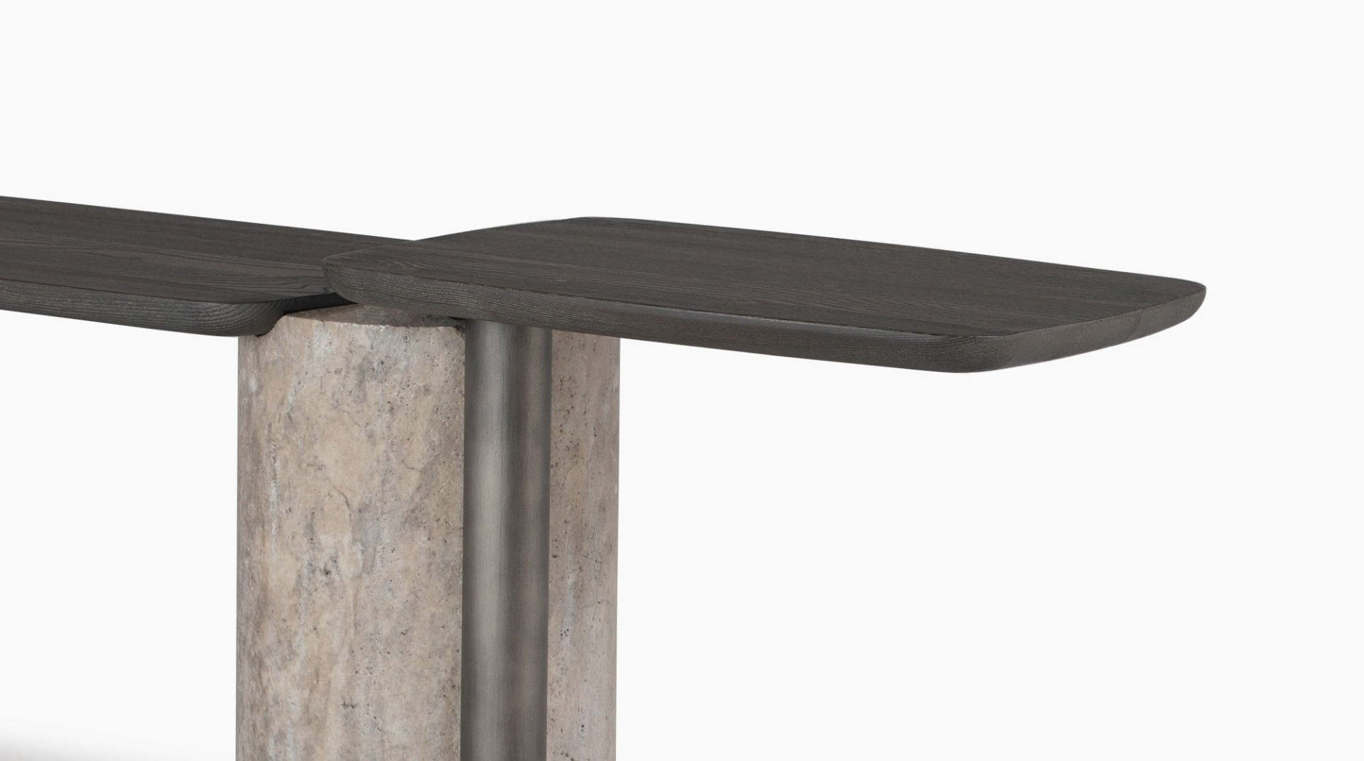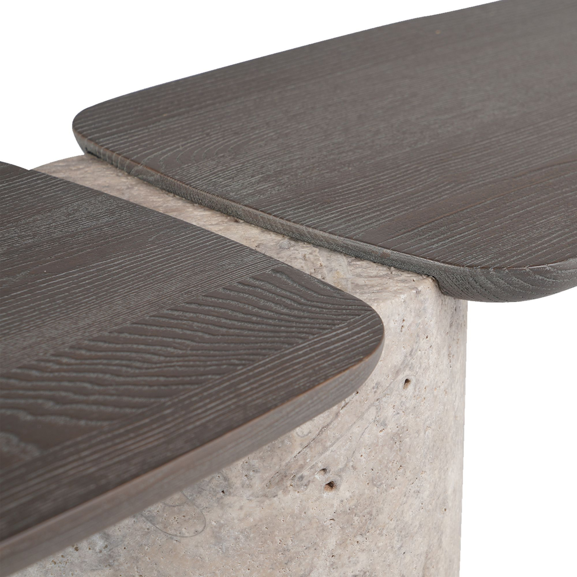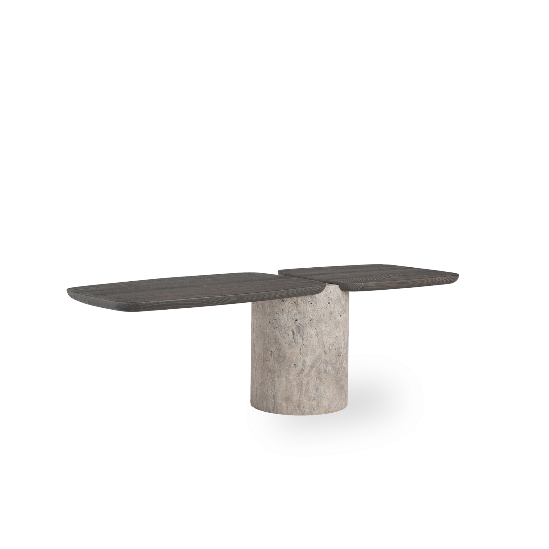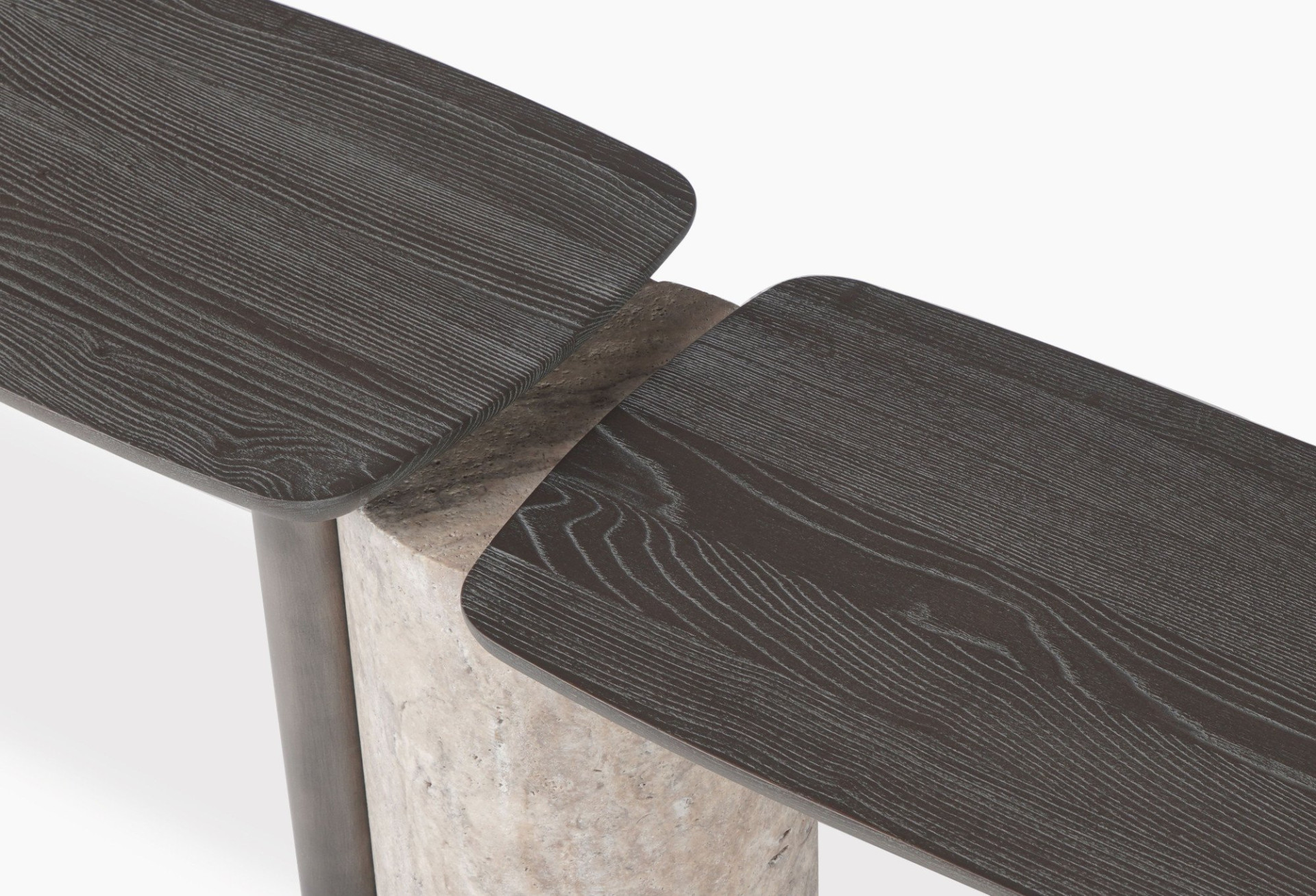 Der Titano Couchtisch wurde als ultimatives Akzentmöbel entworfen und ist in zwei alternativen Formen und Abmessungen erhältlich, um den unterschiedlichen Anforderungen und Vorlieben gerecht zu werden. Titano Couchtisch A erscheint wie ein konzeptioneller Vogel mit weit geöffneten Flügeln. Die abgerundeten Massivholzteile fassen die Hohlräume am oberen Ende der Steinsäule und erzeugen so die asymmetrische, skulpturale Essenz des Produkts. Der Titano Couchtisch B weist ähnliche Merkmale auf, ist aber ein relativ bodenständiger Entwurf mit zusätzlichen Metallbeinen, die die Massivholzplatten tragen. Ein schlankes Metallbein stützt das verlängerte Stück, und ein Metallrohr integriert die Steinsäule, um die kürzere Platte, die höher als das längere Stück liegt, zu halten und zu erhöhen. Alle Materialien werden vor Ort hergestellt; die Steinsäule ist in Travertin und Marmor erhältlich. Für die geschliffenen Massivholz- und Metalloberflächen gibt es zahlreiche Farbvarianten.