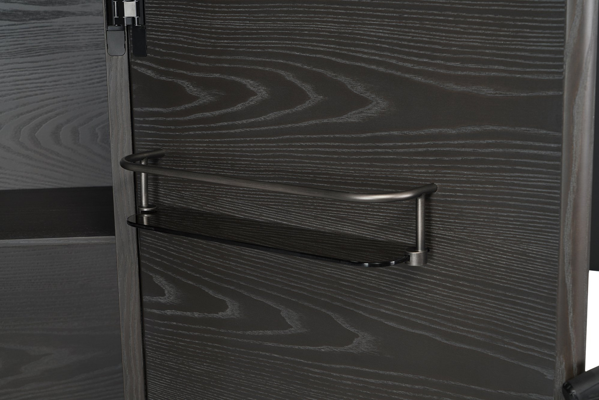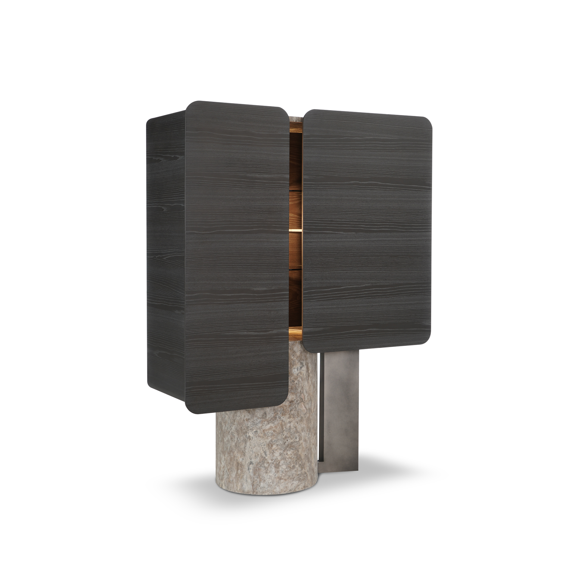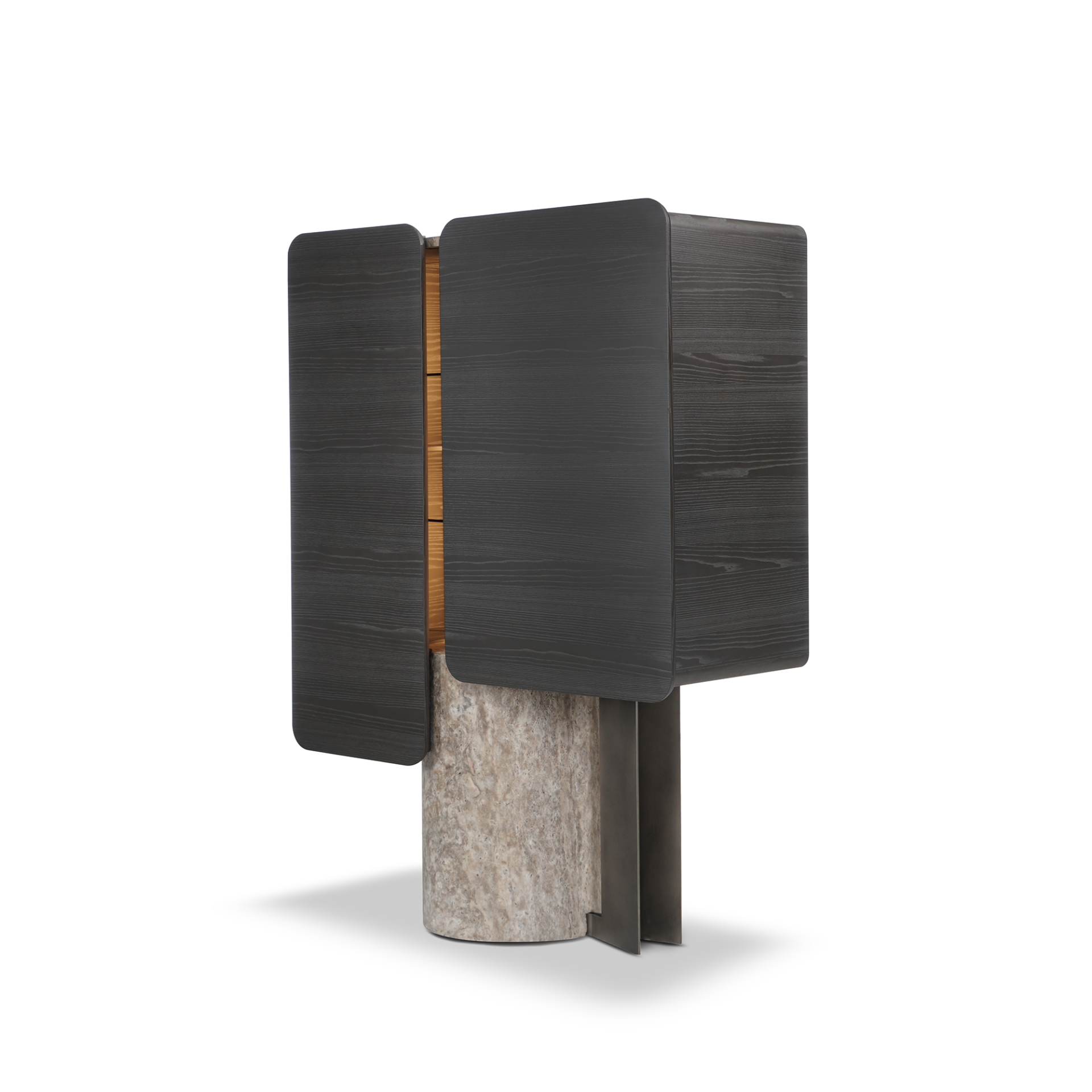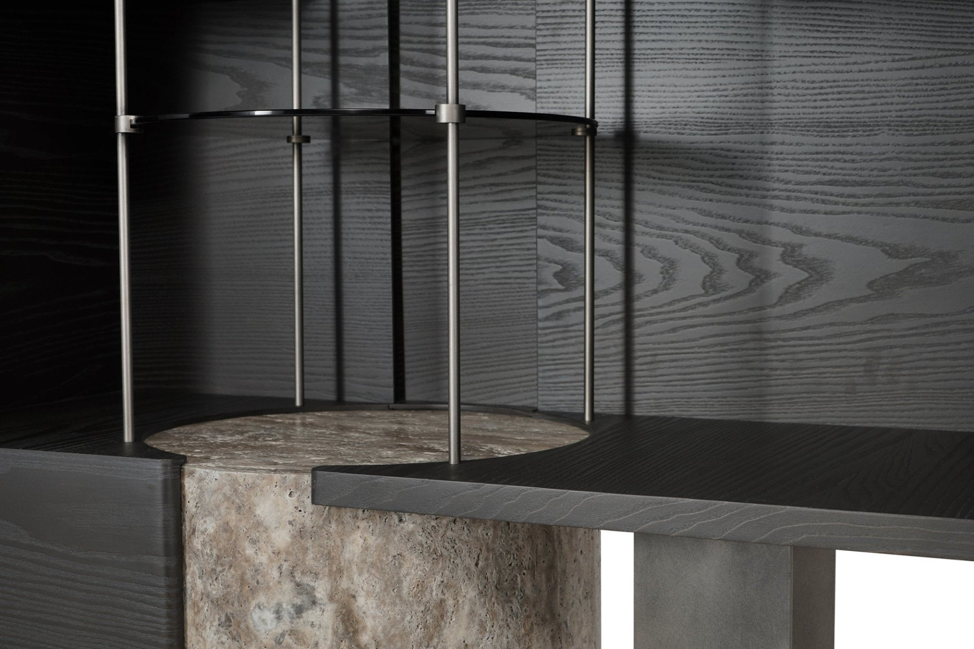 Abgesehen von seiner ausgefallenen Form und seiner gewichtigen Ausstrahlung ist Titano Cabinet mit seinen Überraschungsbox-Qualitäten ein eher verspieltes Design. Jedes einzelne Element des Schranks variiert in Form und Volumen. Die Natursteinsäule erstreckt sich bis zum Boden des Schranks, verschwindet dann hinter den Massivholztüren, um auf der Oberseite des Gehäuses wieder aufzutauchen. Zwei separate quaderförmige Blöcke laufen um die ausgehöhlte Säule herum zusammen und bilden so den Korpus. Das holzfurnierte Gehäuse ist mit LED-Lichtleisten ausgestattet und beherbergt ungewöhnliche Regalaufbauten. Runde Glasböden, die von schlanken Metallstäben getragen werden, legen das nicht greifbare Segment der Steinsäule frei. Die holzfurnierten Regalböden sind mit gebogenen Abschlüssen versehen, die diesen geisterhaften zylindrischen Effekt ergänzen. Ein schwalbenschwanzförmiges Metallbein stützt den länglichen Block. Ursprünglich eine Bar für Spirituosen, kann Titano Cabinet an verschiedene Bedürfnisse angepasst werden und ist eine ausgezeichnete Wahl für Wohn- und Bürozwecke. Die Holzfurnier-, Massivholz-, Naturstein-, Glas- und Metallteile sind in verschiedenen Farben und/oder Texturen erhältlich.