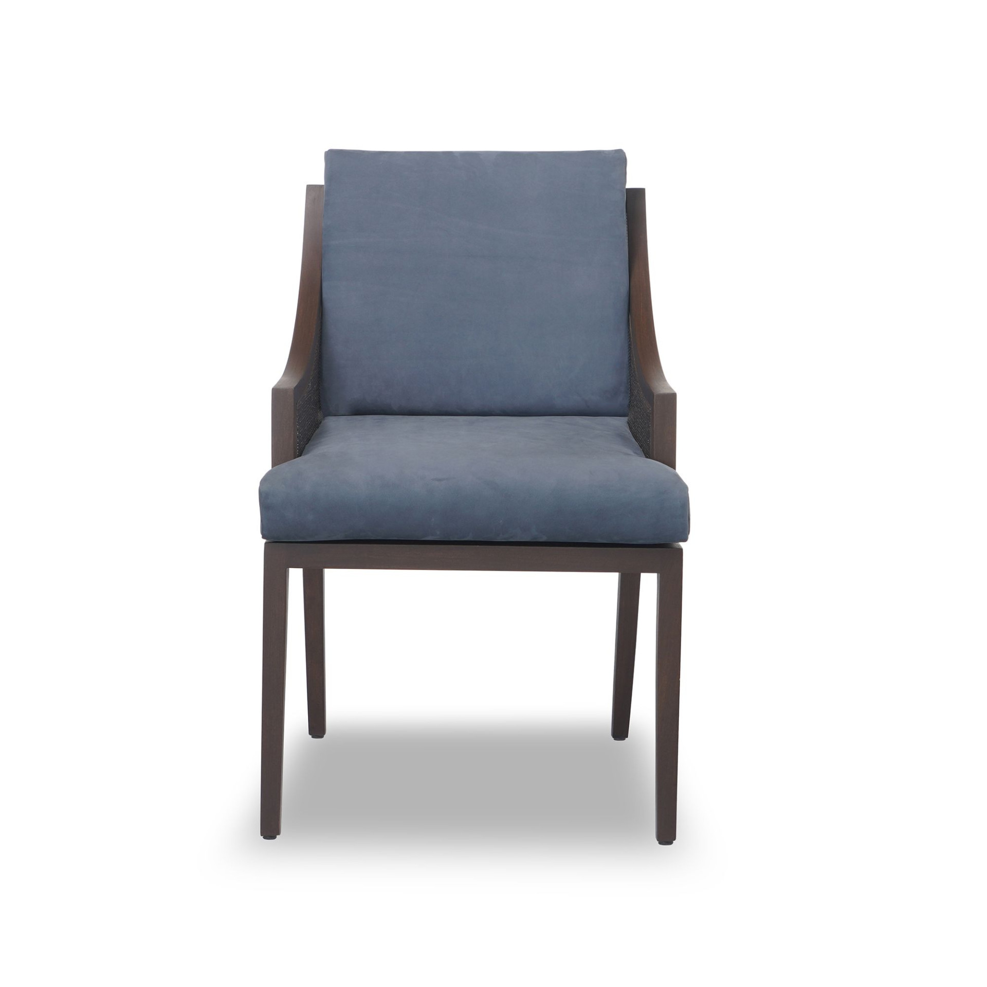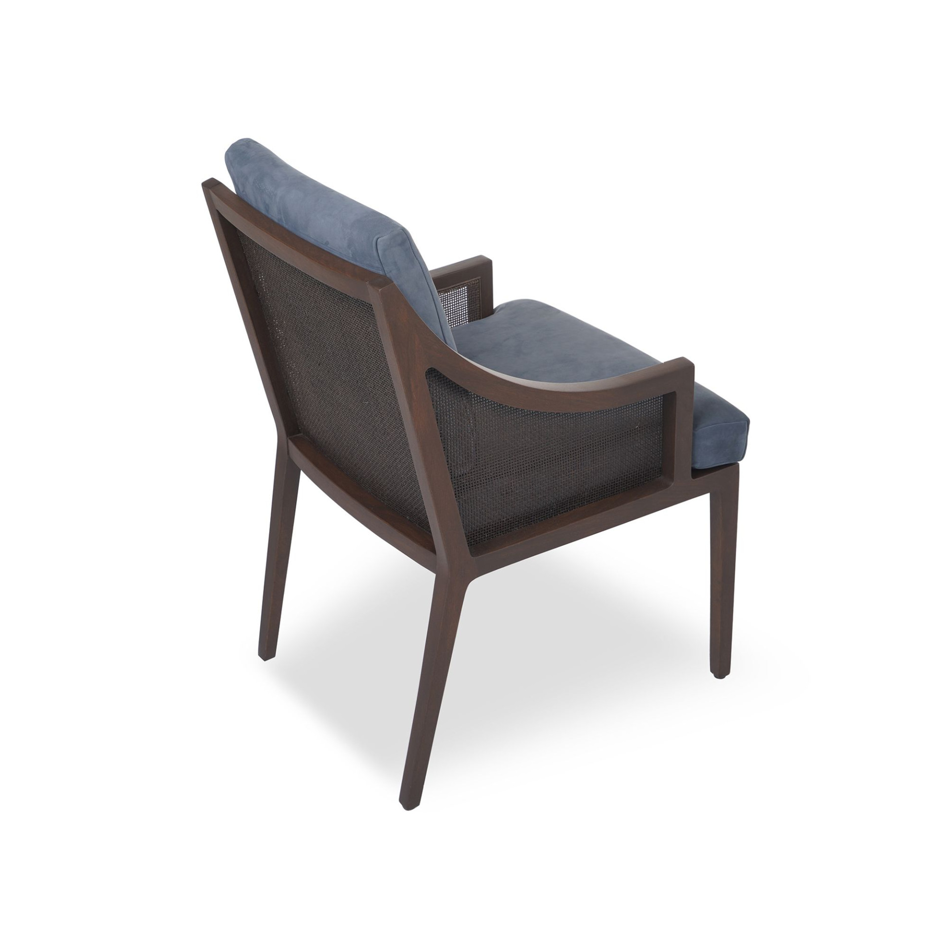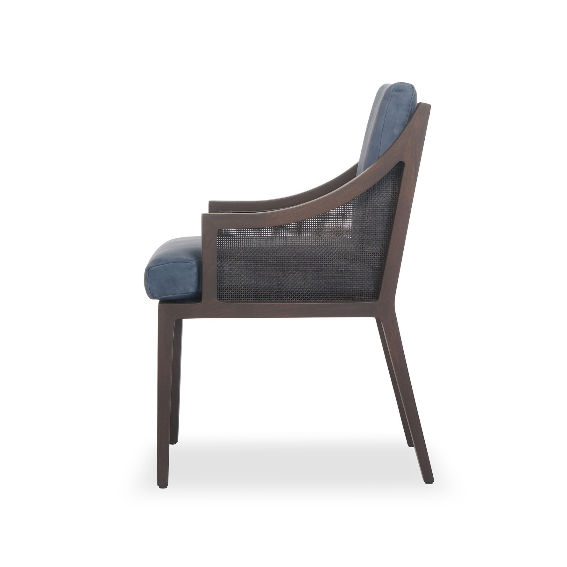Der Toulouse Chair ist die verlängerte und gestraffte Version des Loungesessels und bietet somit eine höhere, aufrechte Sitzposition, obwohl er die gleichen Details wie eine leicht gebogene, hohe Rückenlehne und schräge Armlehnen mit Rattaneinsätzen aufweist. Die Gänsedaunen-Kissen sind mit Stoff oder Leder bezogen. Das Gestell und die Beine aus Massivholz sind in verschiedenen Farbtönen naturbelassen und makellos. Toulouse ist ein ansprechender, komfortabler und dennoch formeller Stuhl, der sich für Wohnräume, Gaststätten und Büros eignet.