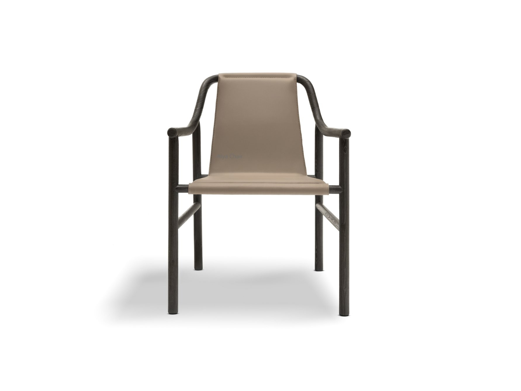 A contemporary chair with a sculptural wooden frame and a suspended leather seat, expressing a raw yet refined character through essential lines and tactile materials. Balanced proportions meet an earthy sense of elegance.