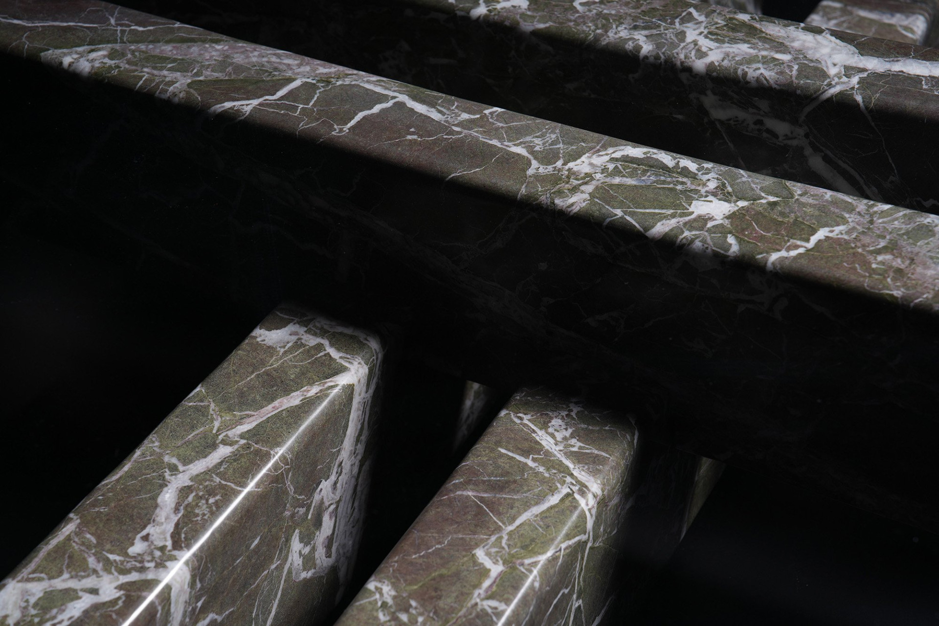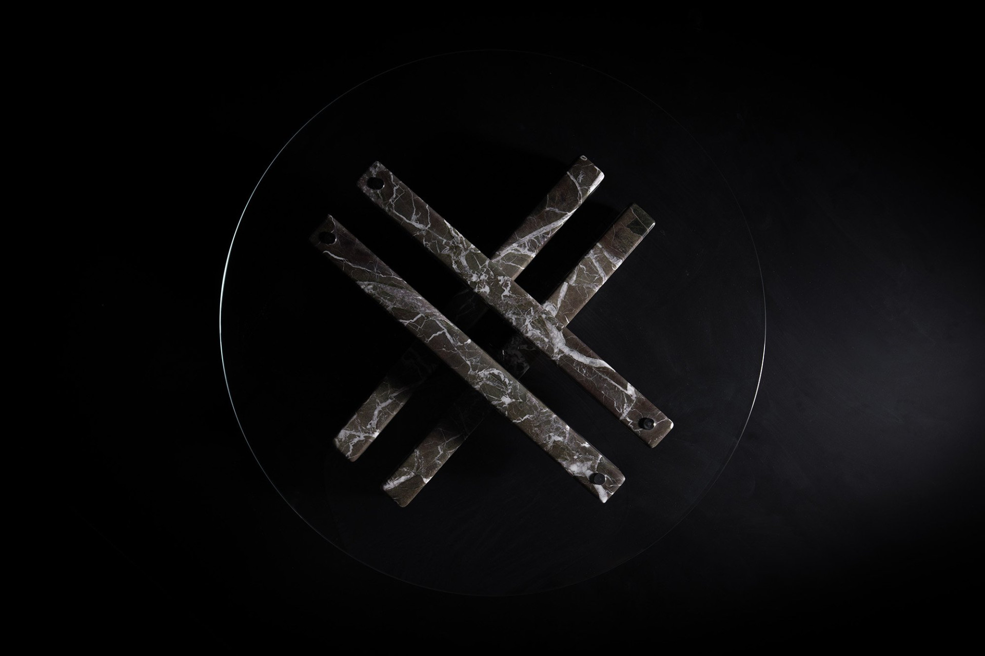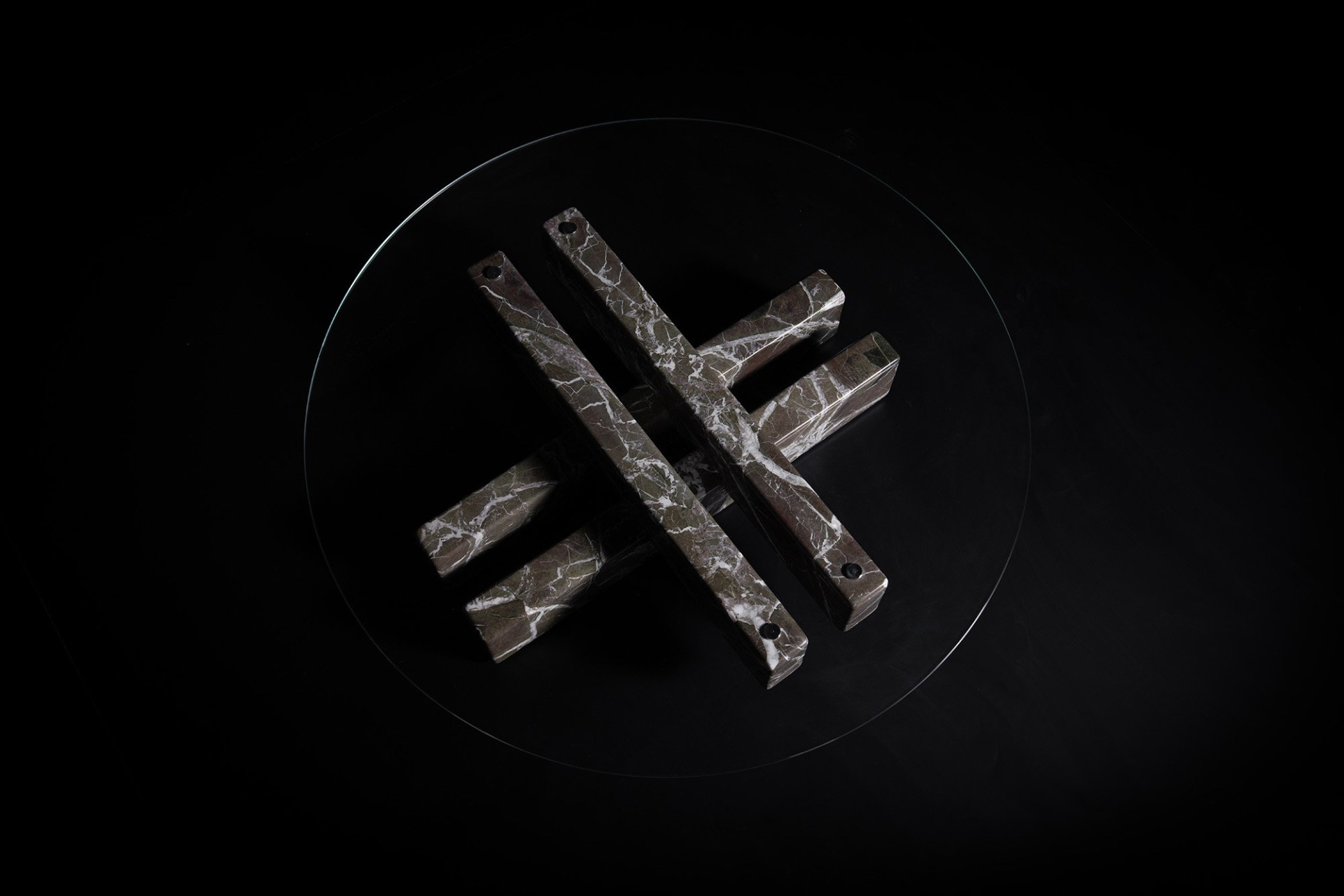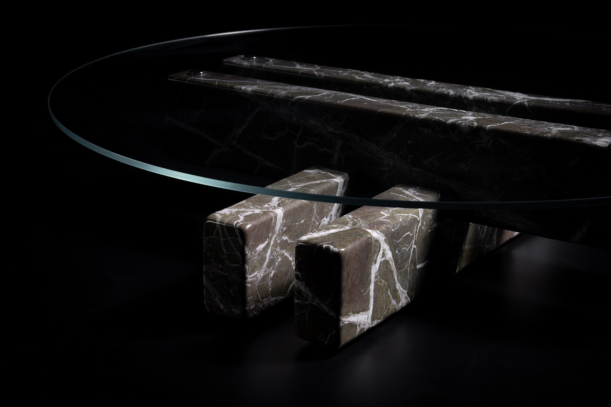 The Jetee Coffee Table is defined by its sculptural marble leg composition—a distinctive statement of contemporary craftsmanship, where intersecting marble elements at ground level transform the structure into an expressive feature merging form and function. Each marble leg, hewn from a single block, shares a harmonious vein pattern while maintaining individuality through distinct cross-sections—creating both unity and variation. The semi-transparent glass top delicately veils the architectural composition beneath, inviting the gaze to linger as subtle forms and intersecting lines gradually reveal themselves. This nuanced transparency preserves a sense of intrigue, enhancing the table’s refined presence.