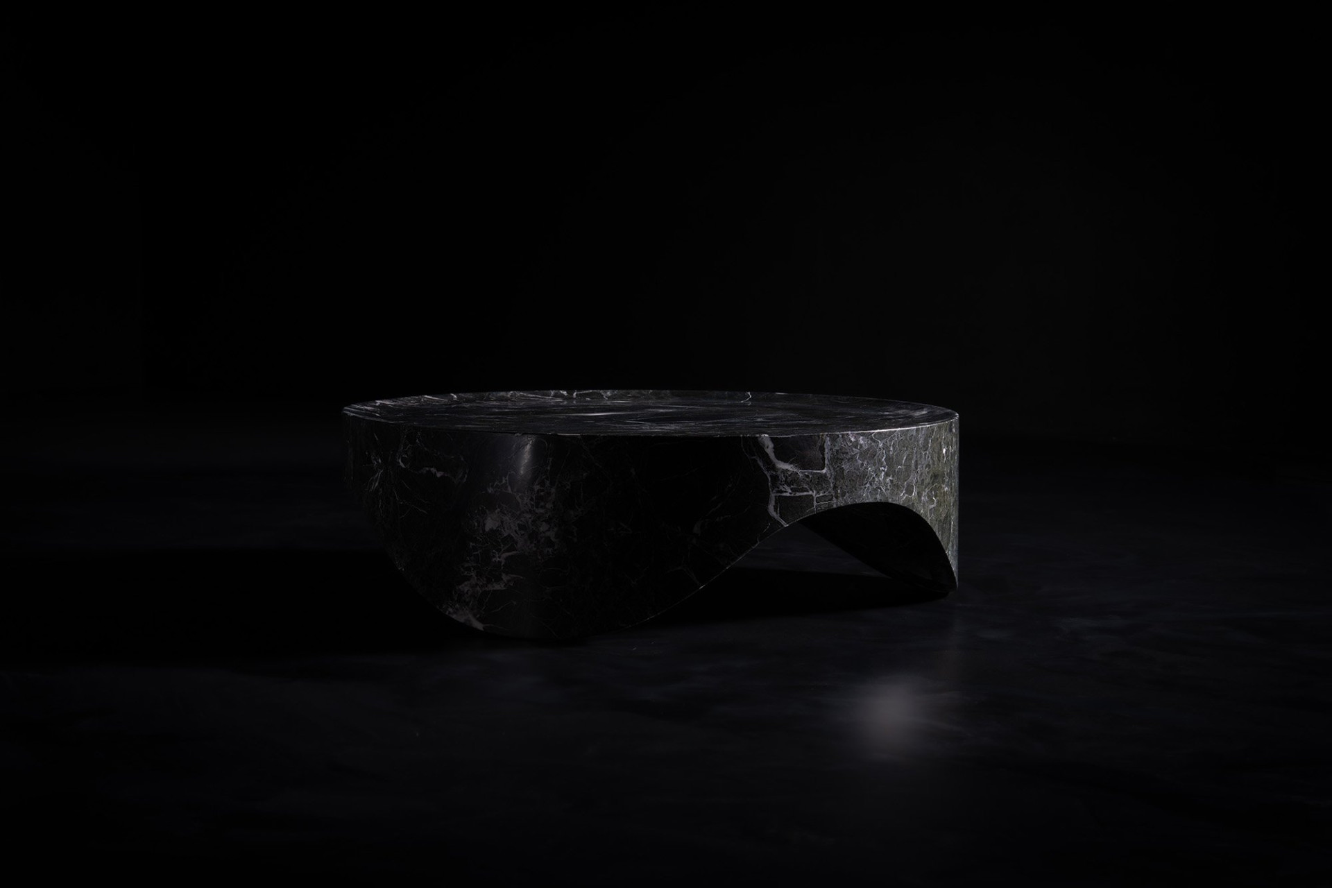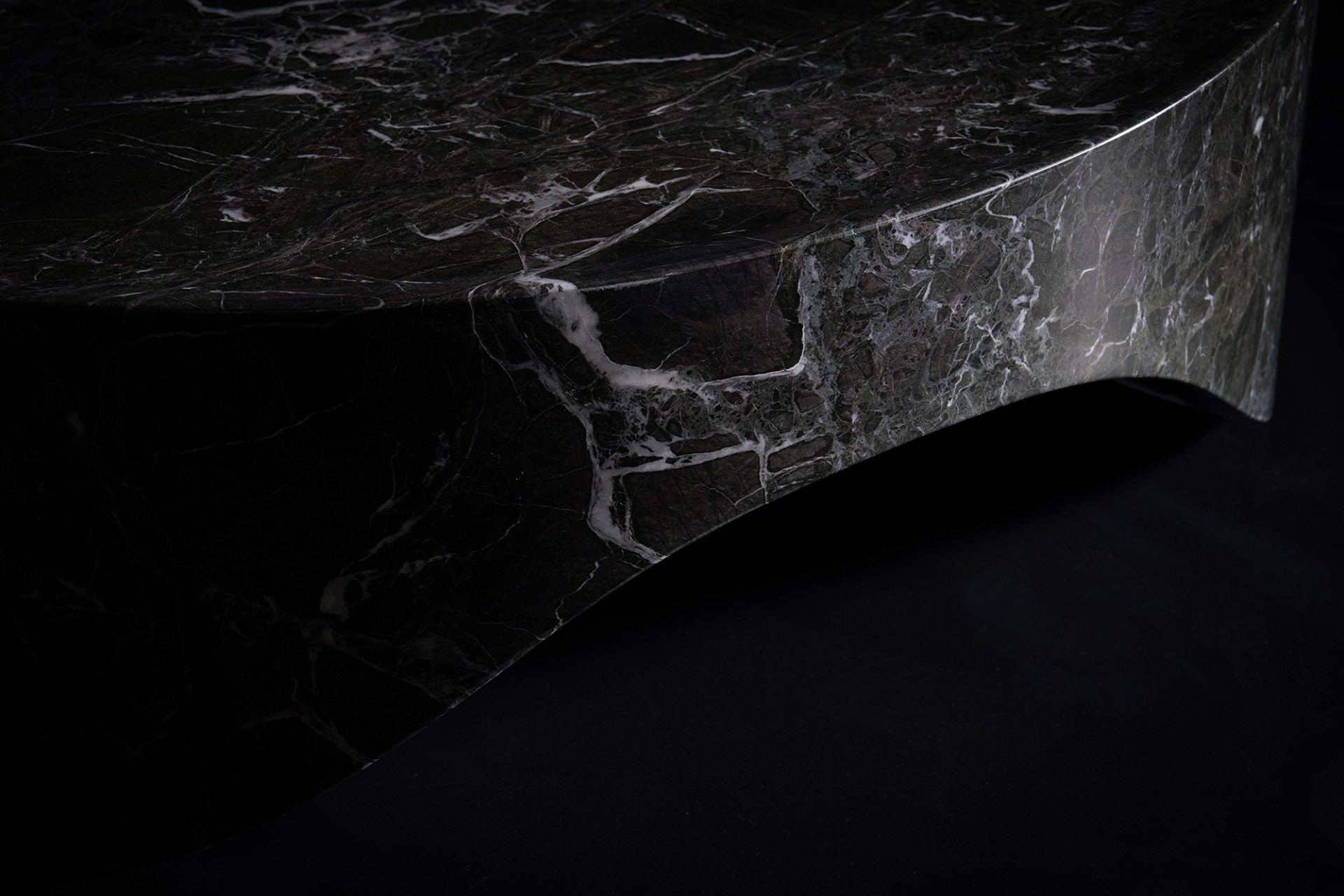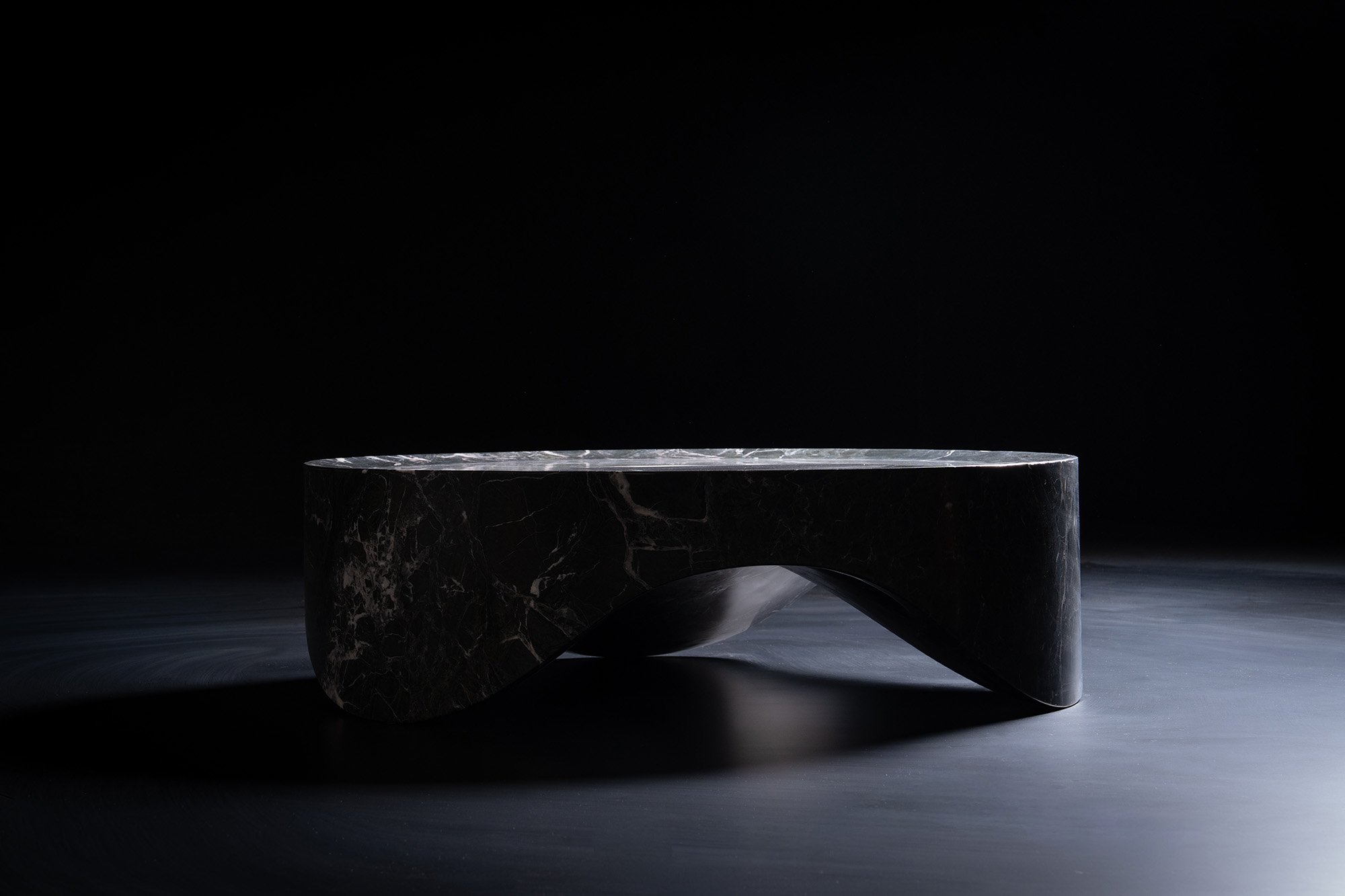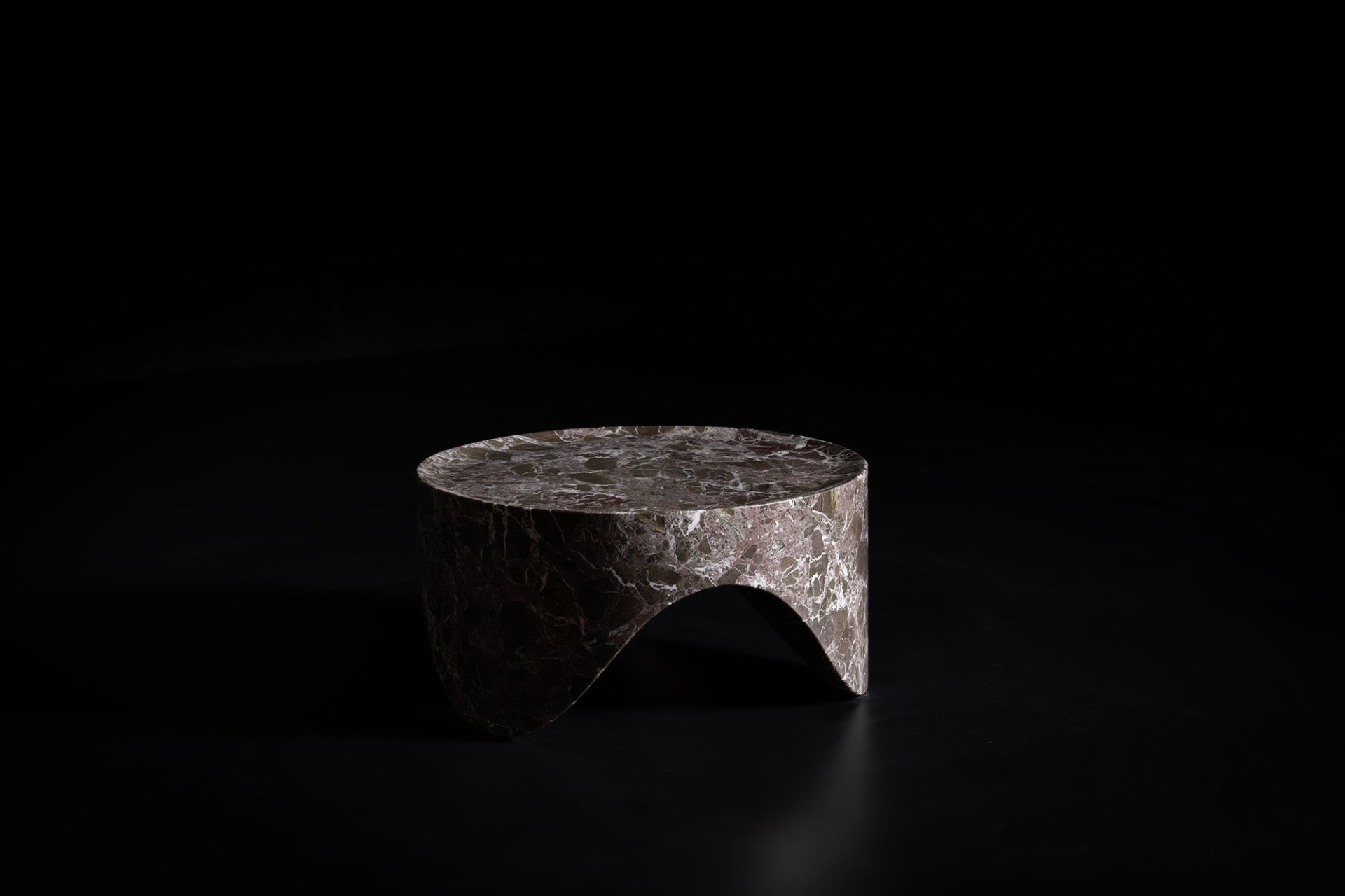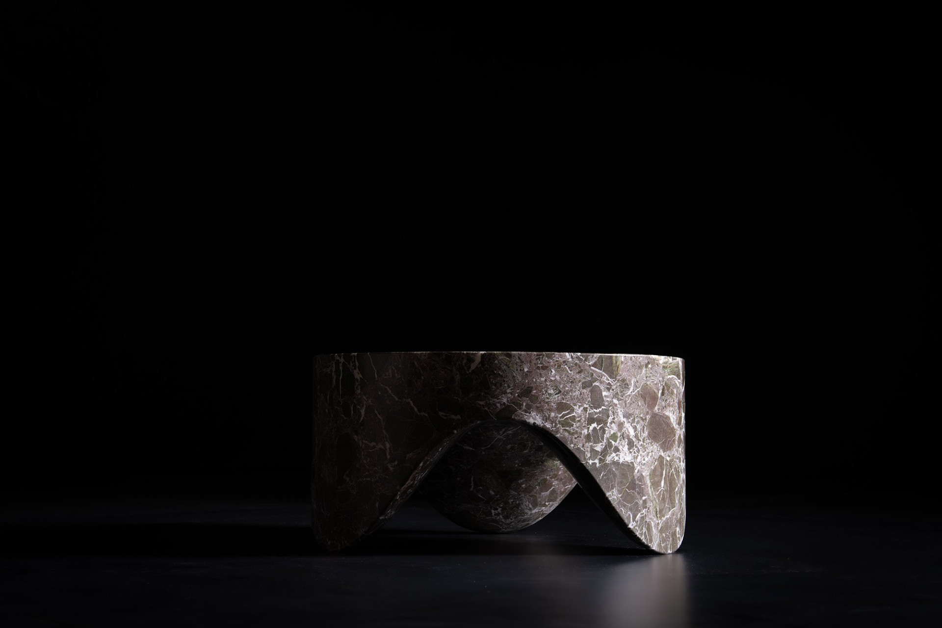 Softened oval edges and a subtle recess on the top surface gently and visually balance the mass. At first glance, it appears unexpectedly light; on closer approach, the density and solidity of the stone gradually become evident. This quiet contrast ultimately defines its presence. The legs are not added elements but emerge directly from the same continuous volume. Three rounded contact points meet the ground with minimal touch, establishing a precise, calm, and deliberate balance. Despite its weight, the form creates a subtle sense of suspension almost in space while remaining firmly grounded. Carved from a single block of marble, the piece reveals the material in its most uninterrupted state. Veining runs continuously across the surface, allowing the stone’s natural character to remain fully visible.