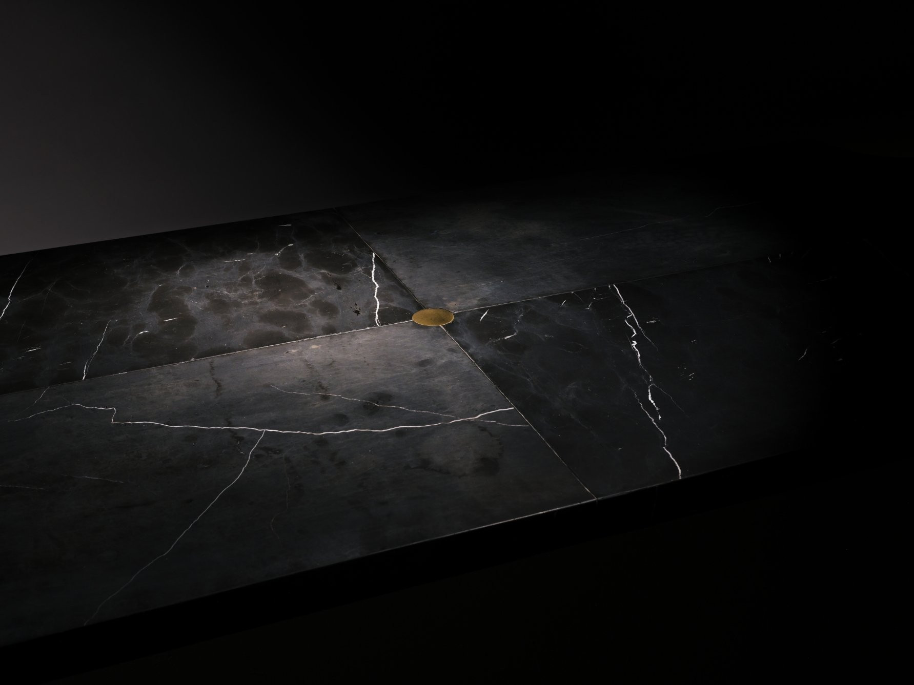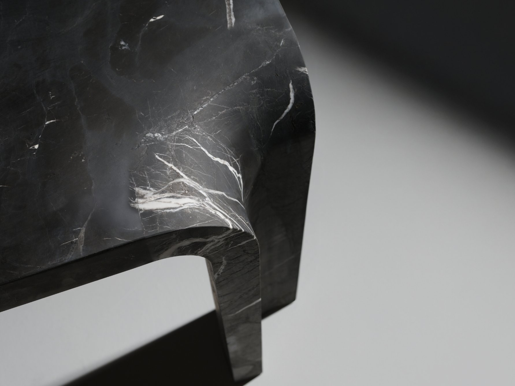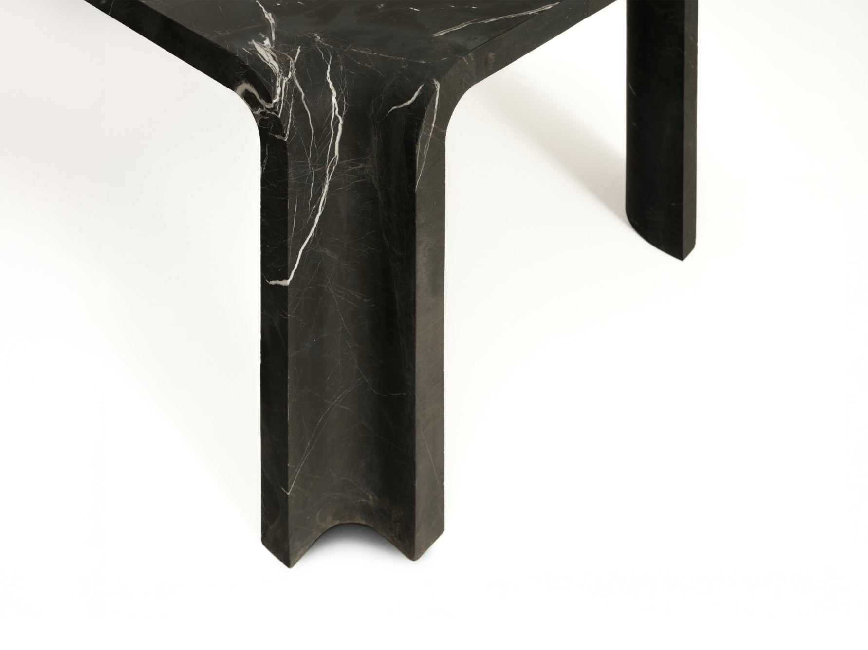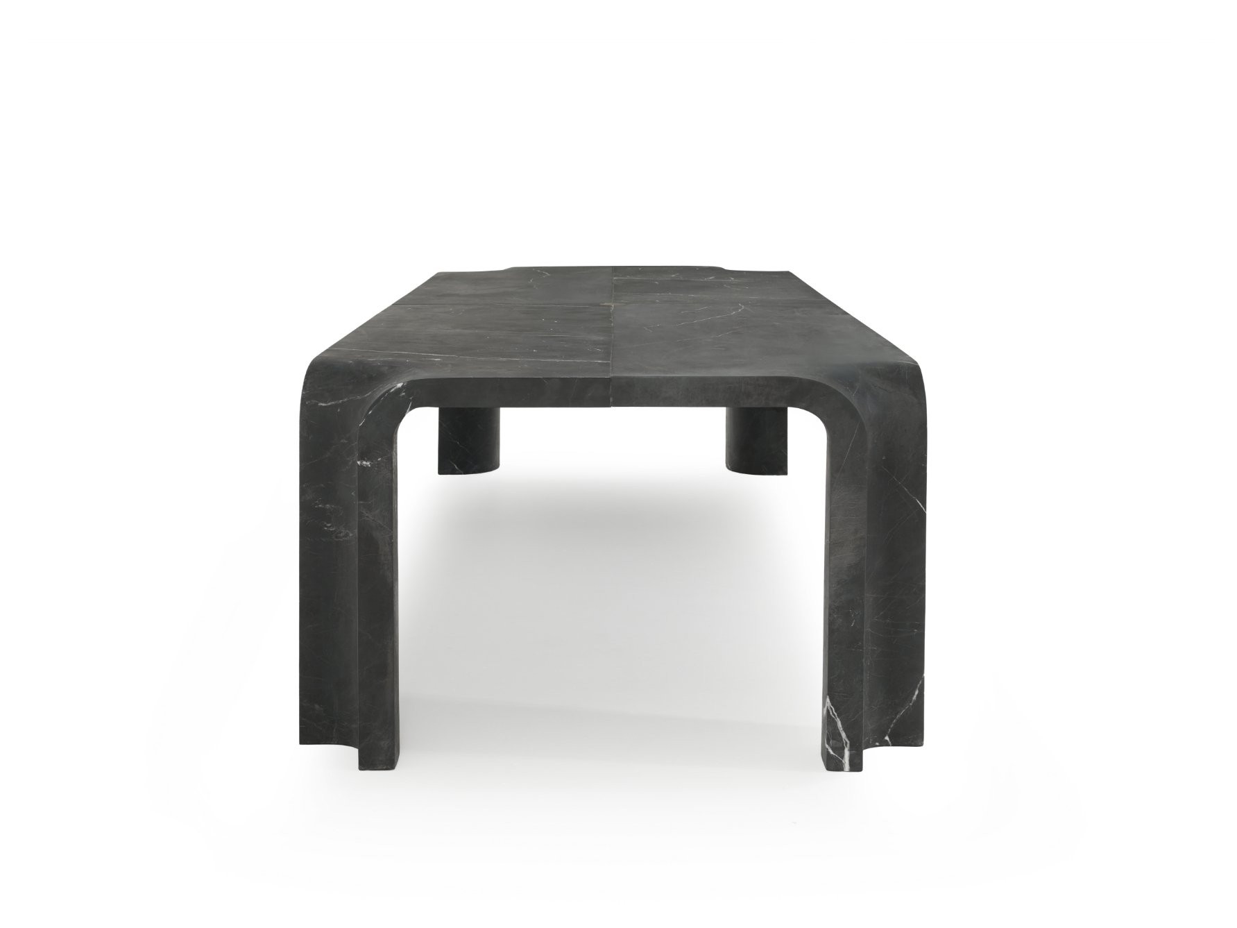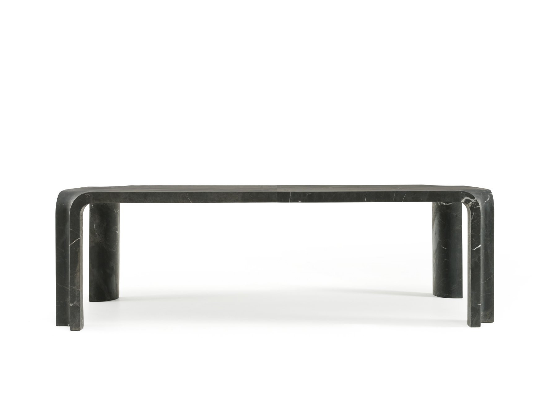 Tamamen mermerden üretilen ve merkezindeki metal aksanı ile dikkat çeken bu masa, cesur silueti ve uyumlu oranlarıyla bulunduğu mekânda güçlü bir duruş sergiler. Geniş yüzeyi, yemek davetleri ve buluşmalar için ideal bir alan sunarken; hem özel hem de ortak yaşam alanlarına kalıcı bir dayanıklılık ve zarif bir estetik kazandırır.