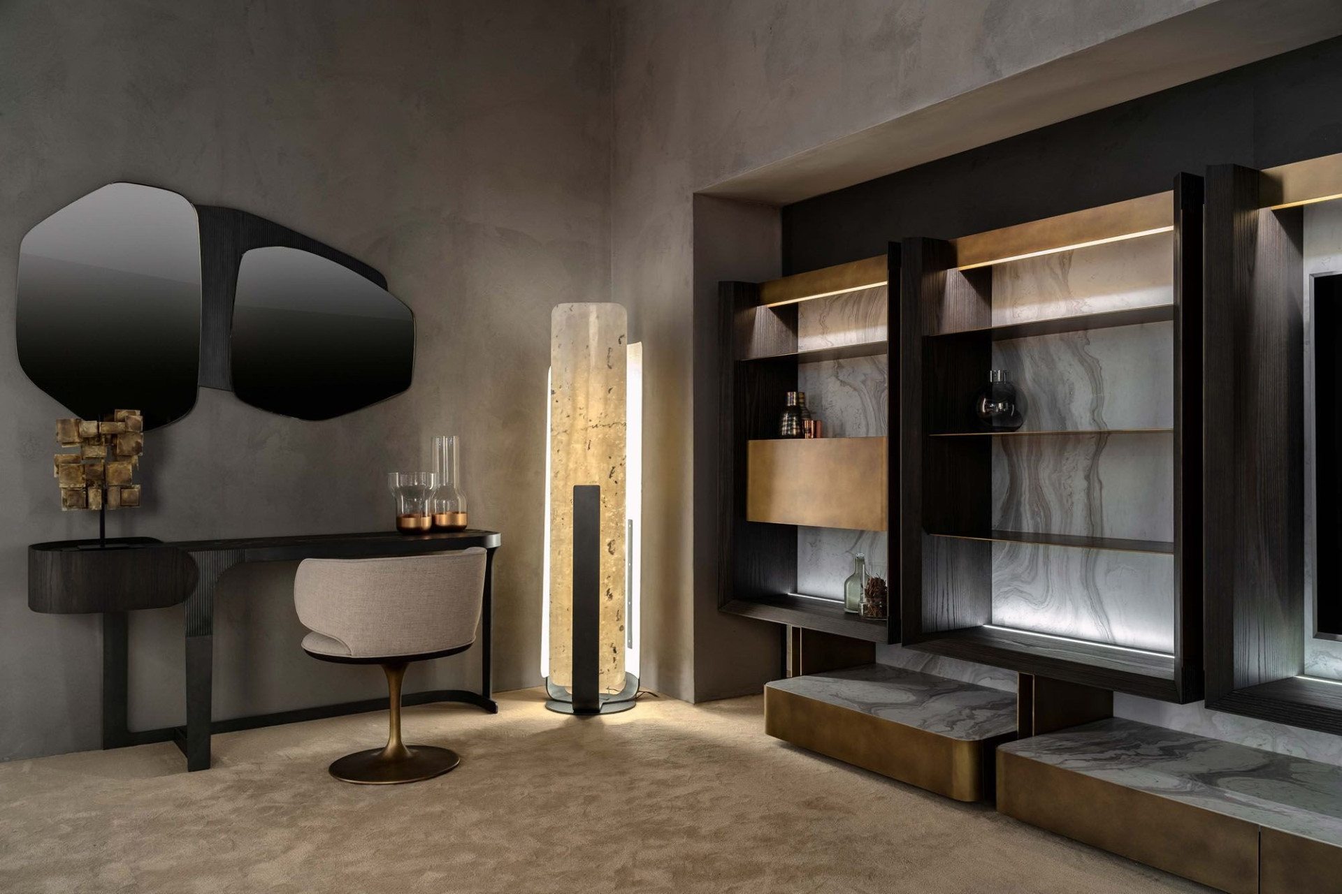 Die perfekte Harmonie von Walnussholz und gealtertem Messing trifft auf die unvergleichliche Textur von Travertinmarmor. Das Canyon Sofa, das die perfekten Linien der Natur widerspiegelt, verleiht Ihrem Zuhause ein ganz neues Konzept von Komfort.