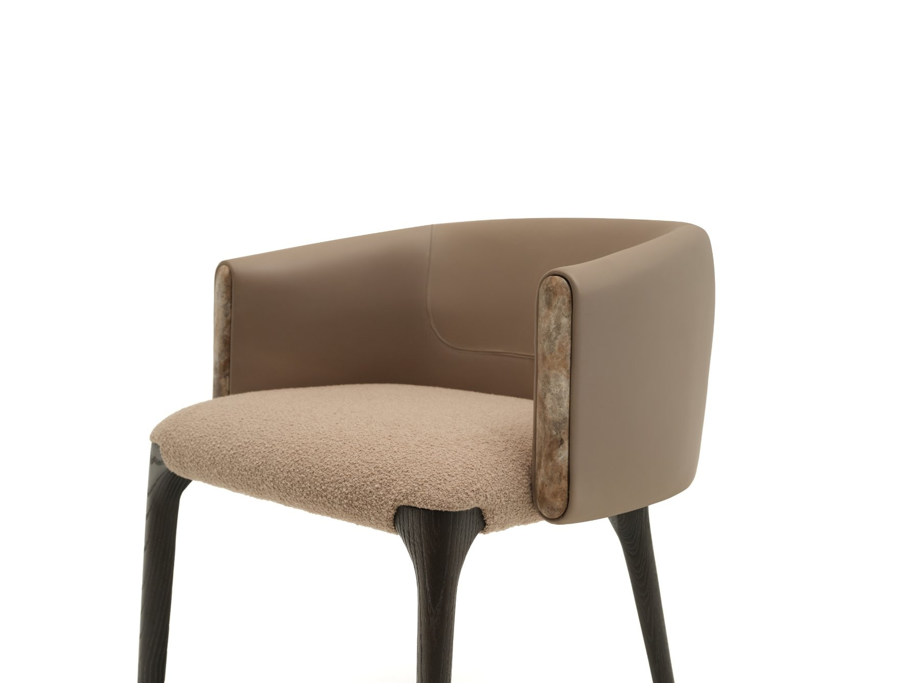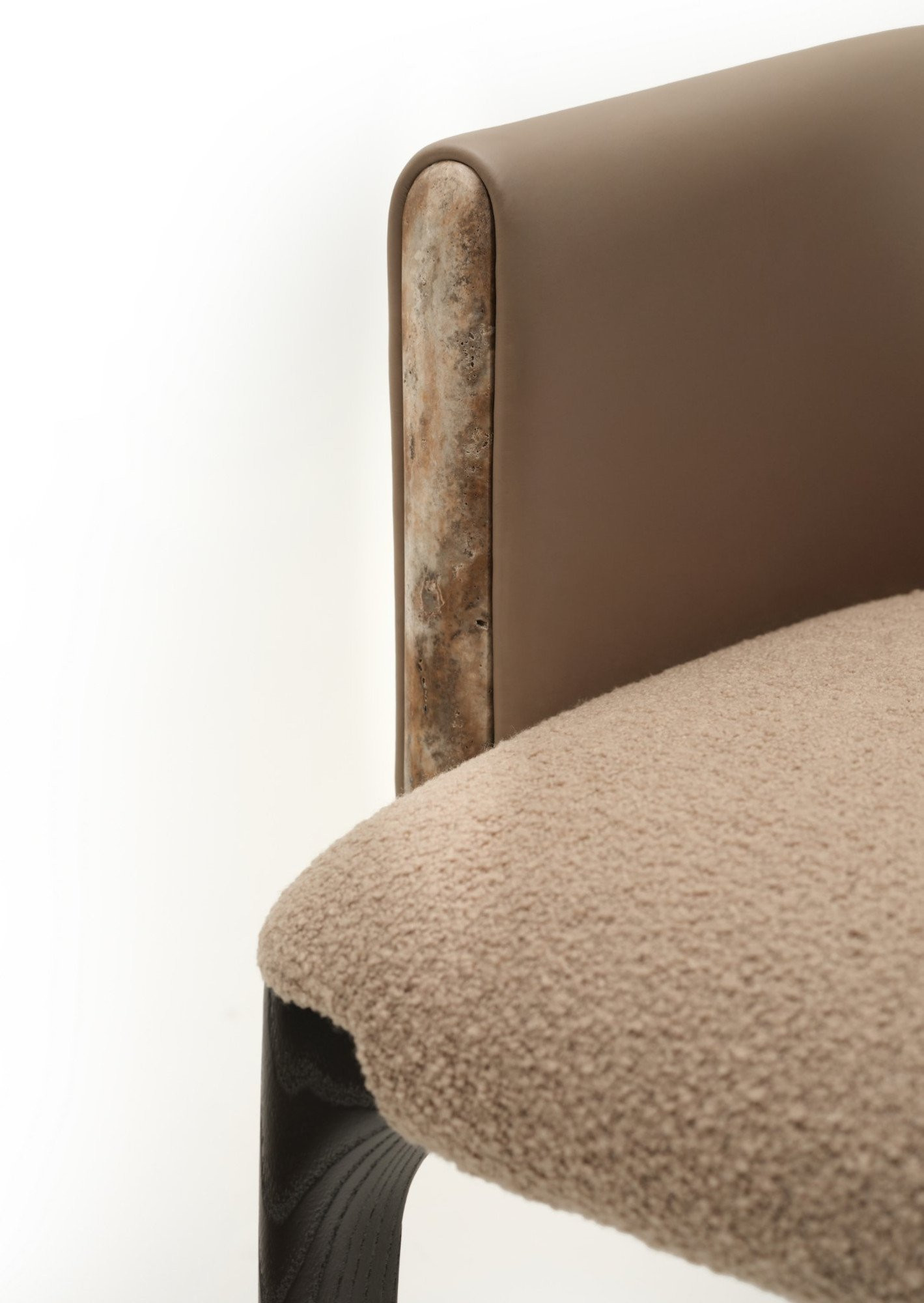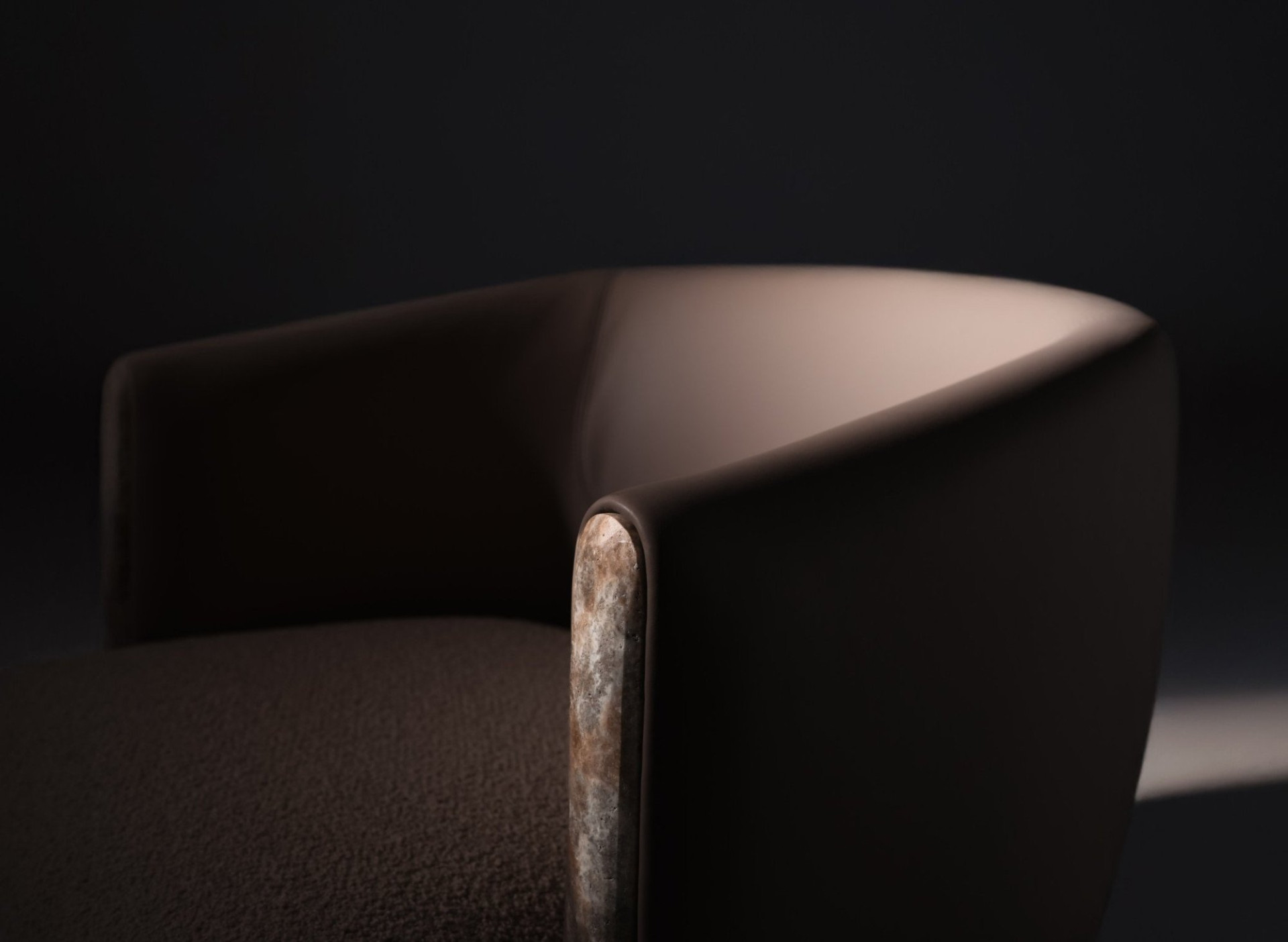 Angelit Sandalye, mermer detayları ve rafine yapısıyla güçlü bir malzeme ifadesi sunar. Temiz çizgileri ve sağlam formu, tasarıma yere sağlam basan bir duruş kazandırır ve toprak elementinin ağırlığını ve karakterini yansıtır.