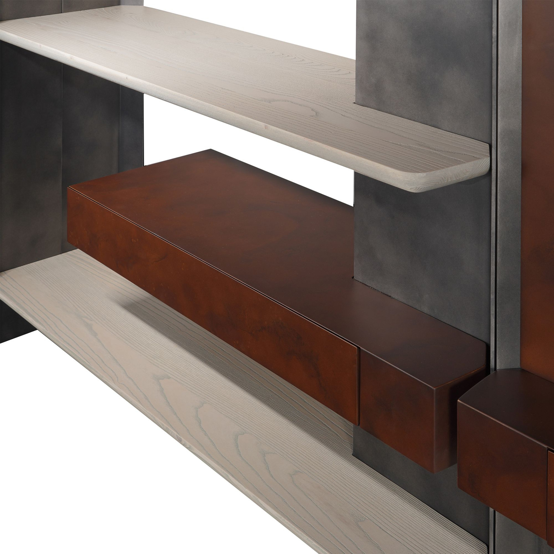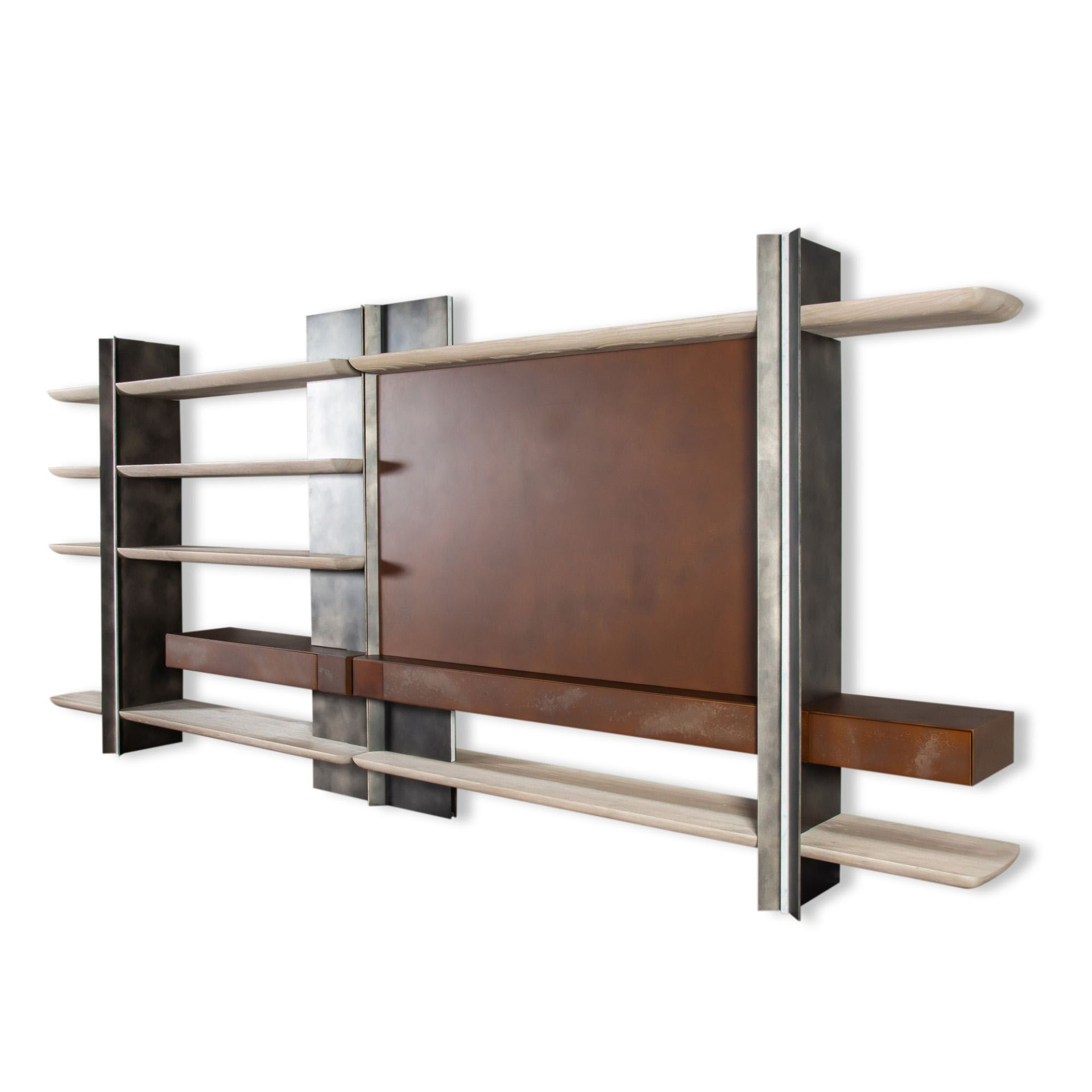 Baskın, ağır, güven veren bir karaktere sahip olan Discovery TV Ünitesi, seriye ait kitaplığın aksesuarlı bir versiyonu. Hacimli, kumlanmış masif ahşap rafları dört metal direkle desteklenen kitaplığa eklenen ahşap kaplama arka panel ve çizgisel çekmece modülleri, kapsamlı yüzey seçenekleriyle çok sayıda kişiselleştirilmiş çözüm vaat ediyor. Ekstra doku kazandırmak için fırçalanmış metal desteklerin farklı renkleri, masif rafların çeşitli ahşap alternatifleri, ahşap kaplama yüzeylerin ise, metalik boya ve lake seçenekleri mevcut.