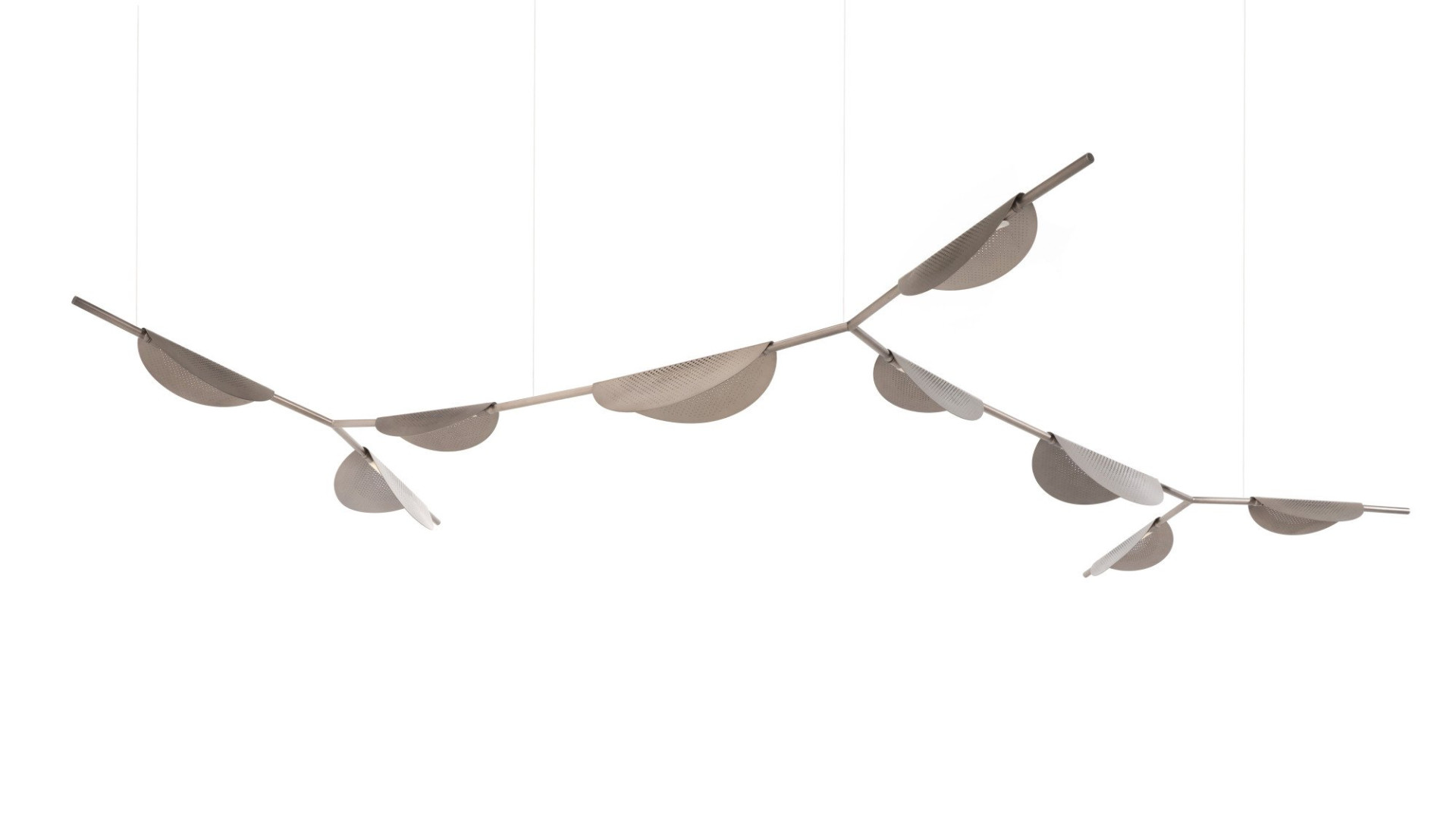 Doğanın esnek, tekrarlı motiflerine övgü niteliği taşıyan Half Moon Aydınlatma, ağaç dalını andıran modüler metal iskelete bağlı yapraksı siperlerin ardına saklanmış LED şeritlerden oluşuyor. Perfore sacdan iki boy ve çeşitli renklerde üretilen siperler iskelete bağlandıktan sonra, ışığın yönünü değiştirmek için kolayca hareket ettirilebiliyor. Otel, restoran, mağaza veya diğer kamusal alanların yanı sıra kişisel oturma ve yemek odalarında tercih edilen ürünün sarkıt, lambader, aplik ve masa lambası seçenekleri bulunuyor. İster dev bir enstalasyon ister tek ünite aydınlatma olarak kullanılsın, Half Moon Aydınlatma Sistemi, her türlü iç mekâna sanatsal bir nitelik kazandırıyor. Masa lambası ve lambader versiyonları, dairesel mermer tabanlar sayesinde zemine oturuyor. Sarkıt aydınlatmanın iki, üç veya beş yaprak/ siperli seçenekleri ile dikdörtgen bir yemek/toplantı masasıyla kullanıma uygun düz veya eğri lineer gövde alternatifleri bulunuyor.