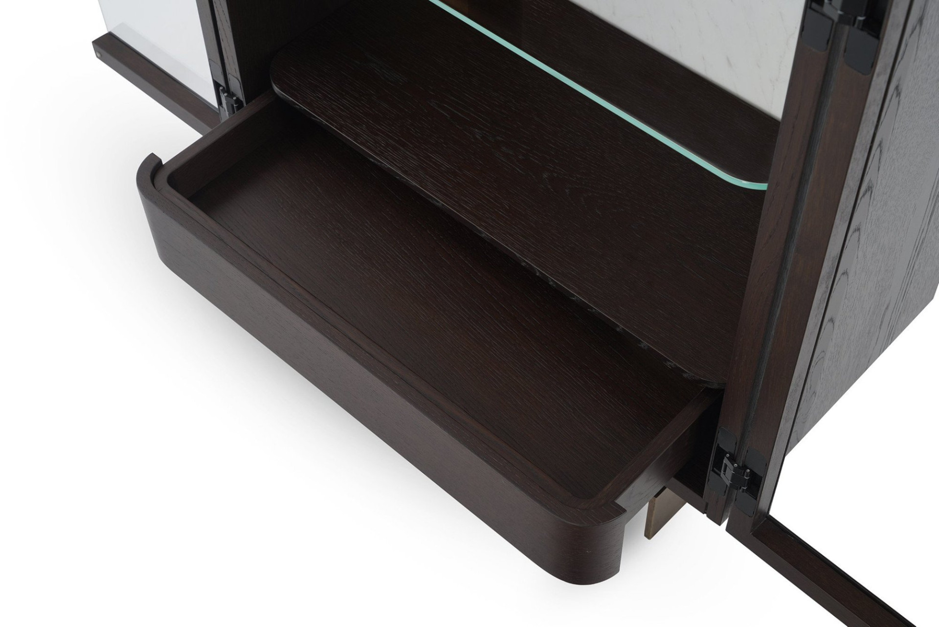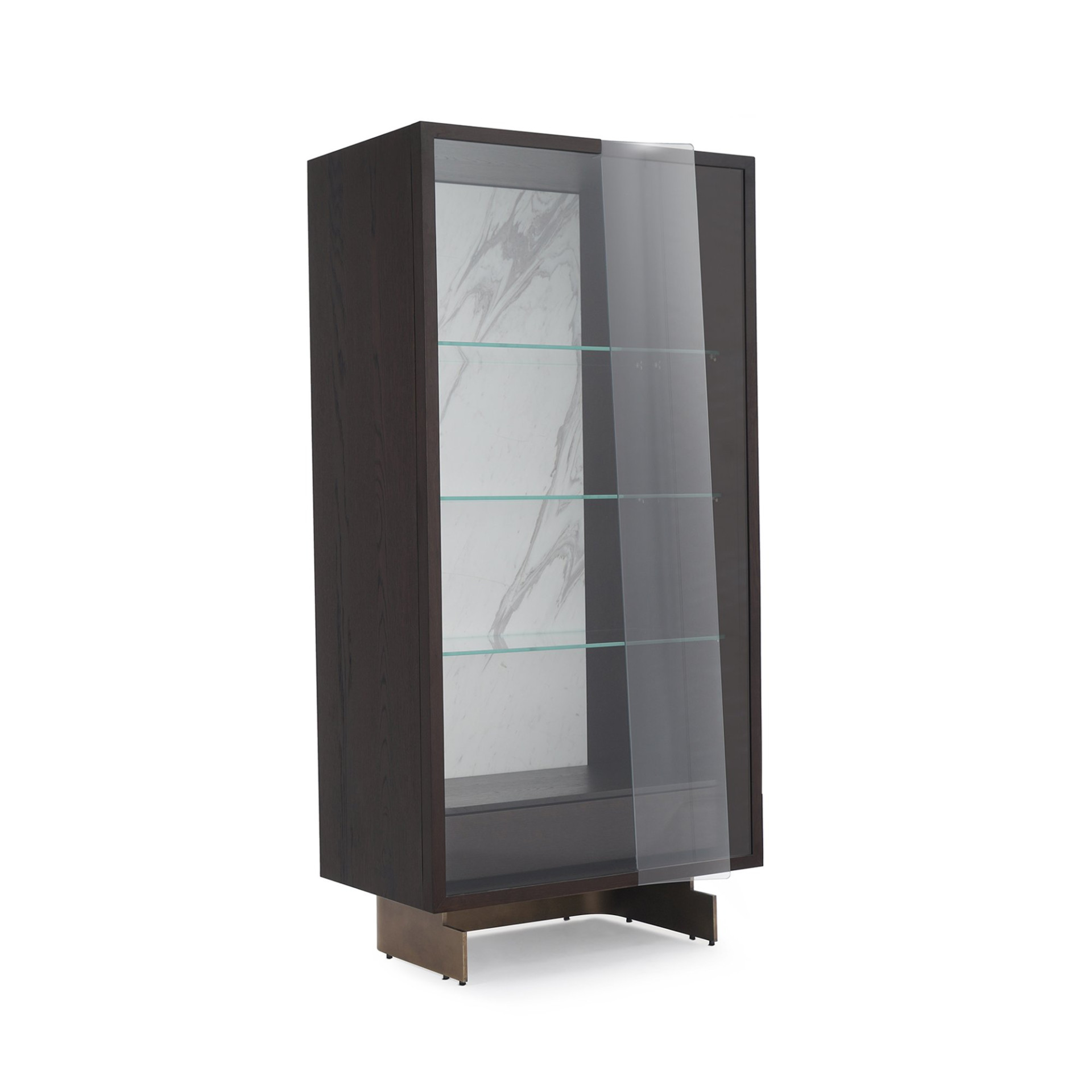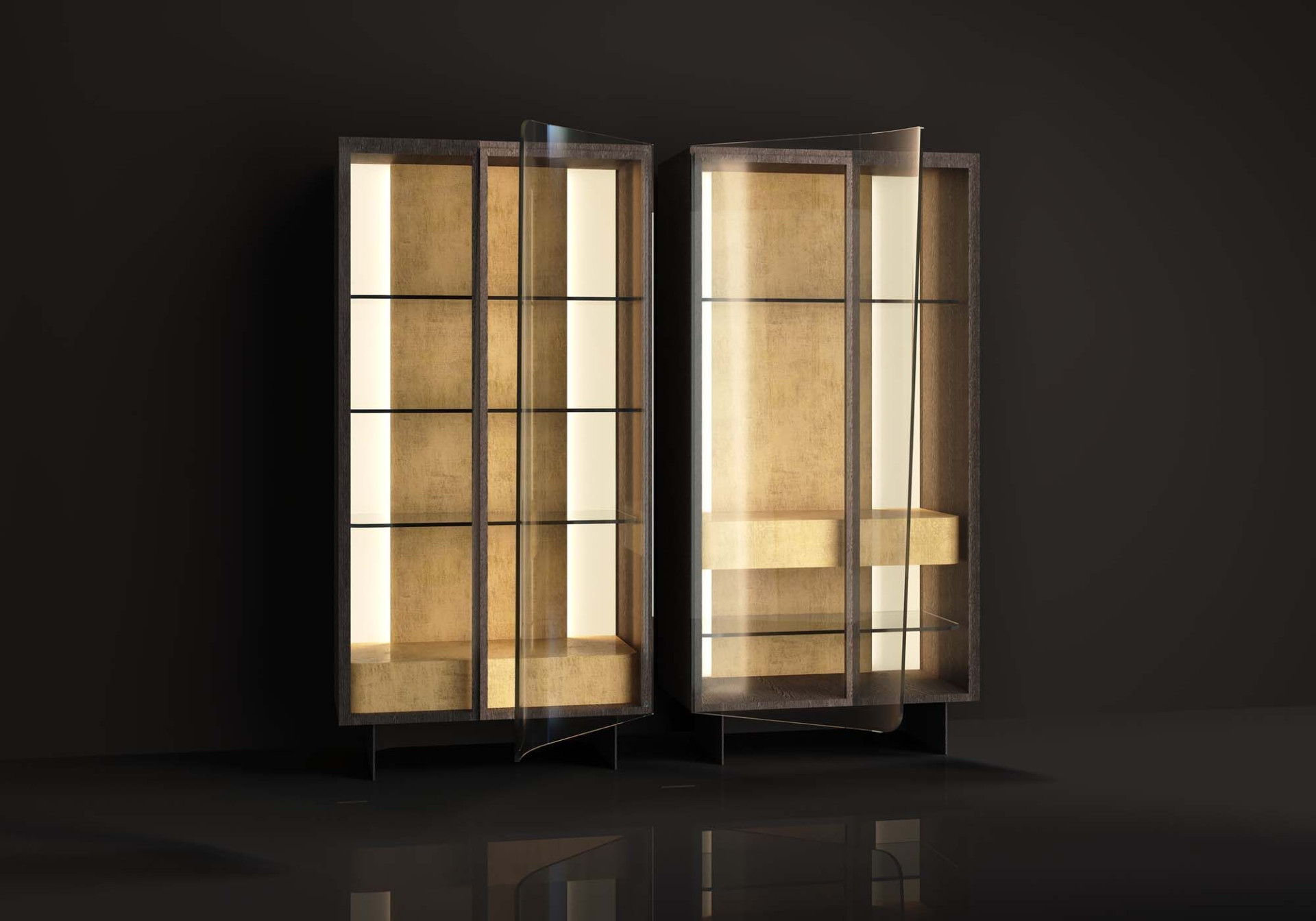 Üç asırlık cam sanatı geleneğiyle nam salmış İstanbul'un prestijli cam ustaları tarafından üretilen şeffaf cam kapaklarının şaşırtıcı, imkânsız kıvrımlarıyla öne çıkan Leaf Vitrin, koleksiyonun diğer parçalarıyla aynı özgün dili konuşan bir yapıya sahip. Ahşap kaplama kabinin içine yerleşen cam raflar ve ahşap çekmece ünitesi, iki farklı kombinasyonda üretiliyor ve kullanıcıyla buluşuyor. Kişisel hazinelerin tüm görkemini sergilemek için yaratılmış kasanın içindeki mermer fon, gizli LED ışık havuzu ile vurgulanırken ürünün her türlü mobilya kombinasyonu için göz kamaştırıcı bir zemin oluşturması sağlanıyor. İncecik metal ayaklar ise, ürünü yükseltip tasarımın kütlesel bütünlüğünü pekiştiren önemli bir unsur.