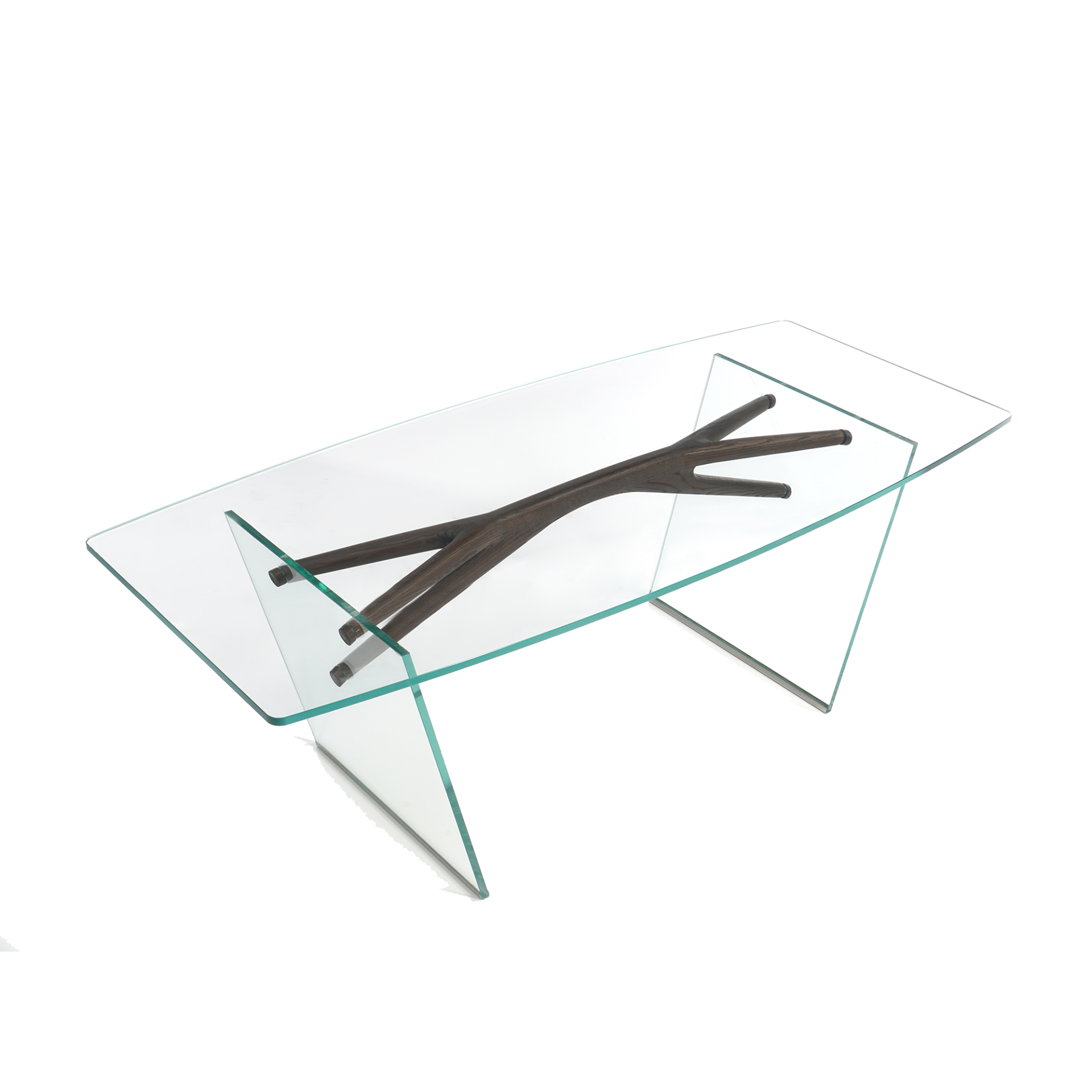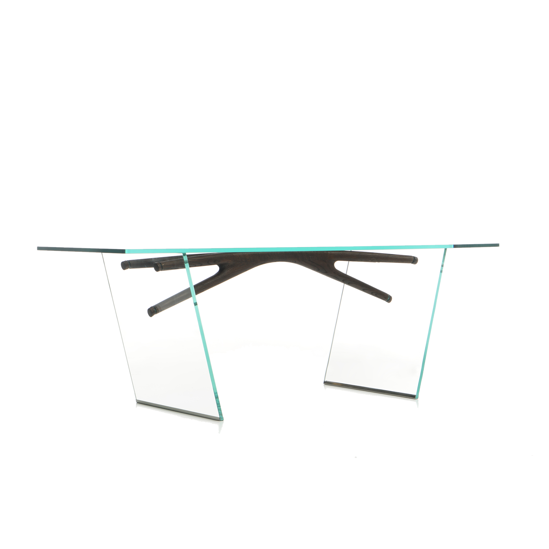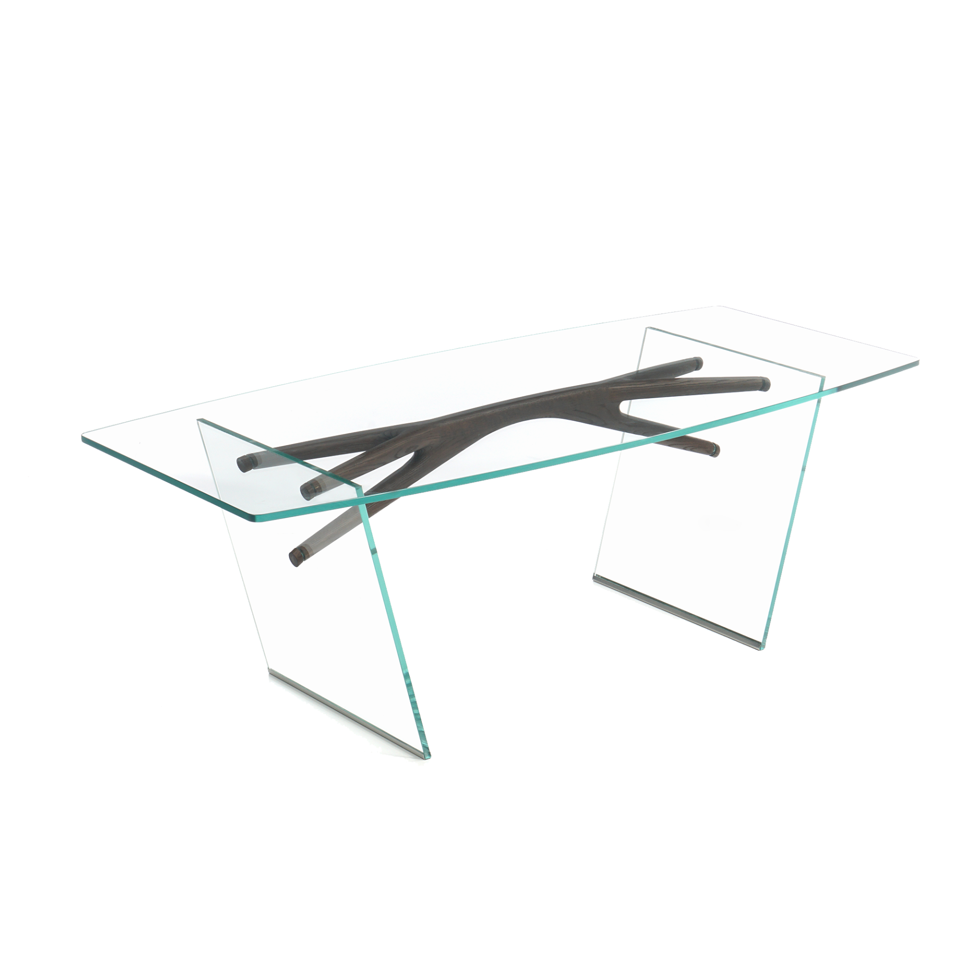 Masanın hatlarını vurgulayan masif cevizden yapısal bir eleman tarafından desteklenen şeffaf bir cam masa.