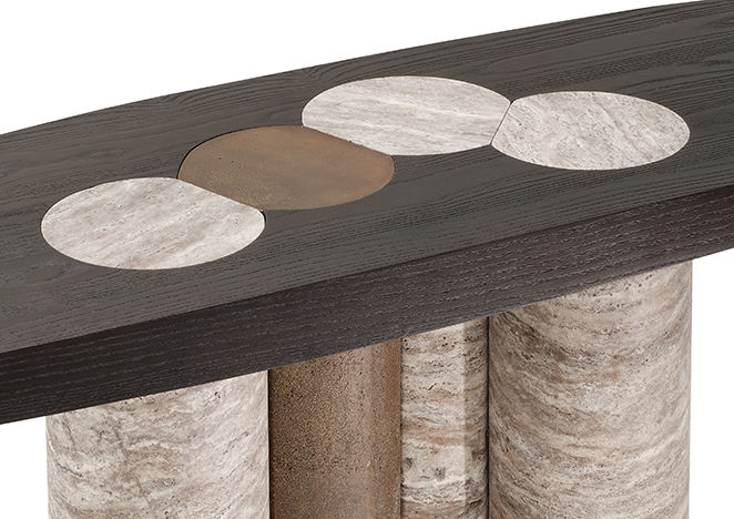 The console’s brass and travertine feet are unique and add an unparalleled touch of elegance and style to your interior design. The exquisite combination of materials creates a striking contrast with the rich chestnut wood, drawing the eye to its visual appeal.