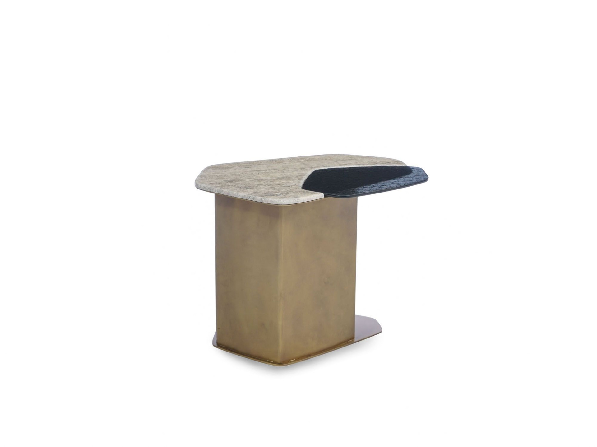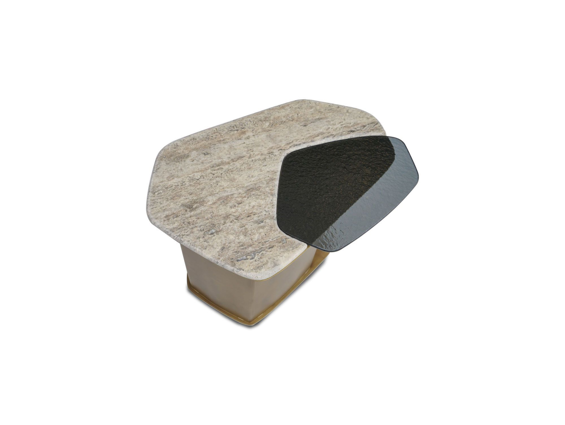 Traverten, füzyon cam ve metalin uyumundan doğan Stratos yan sehpa.