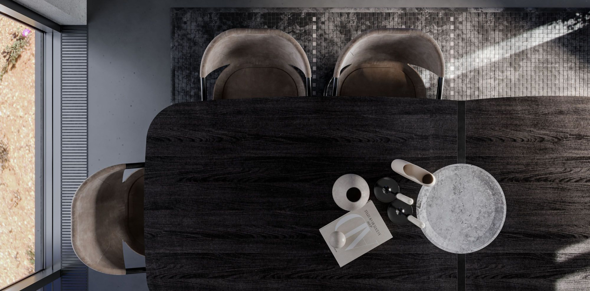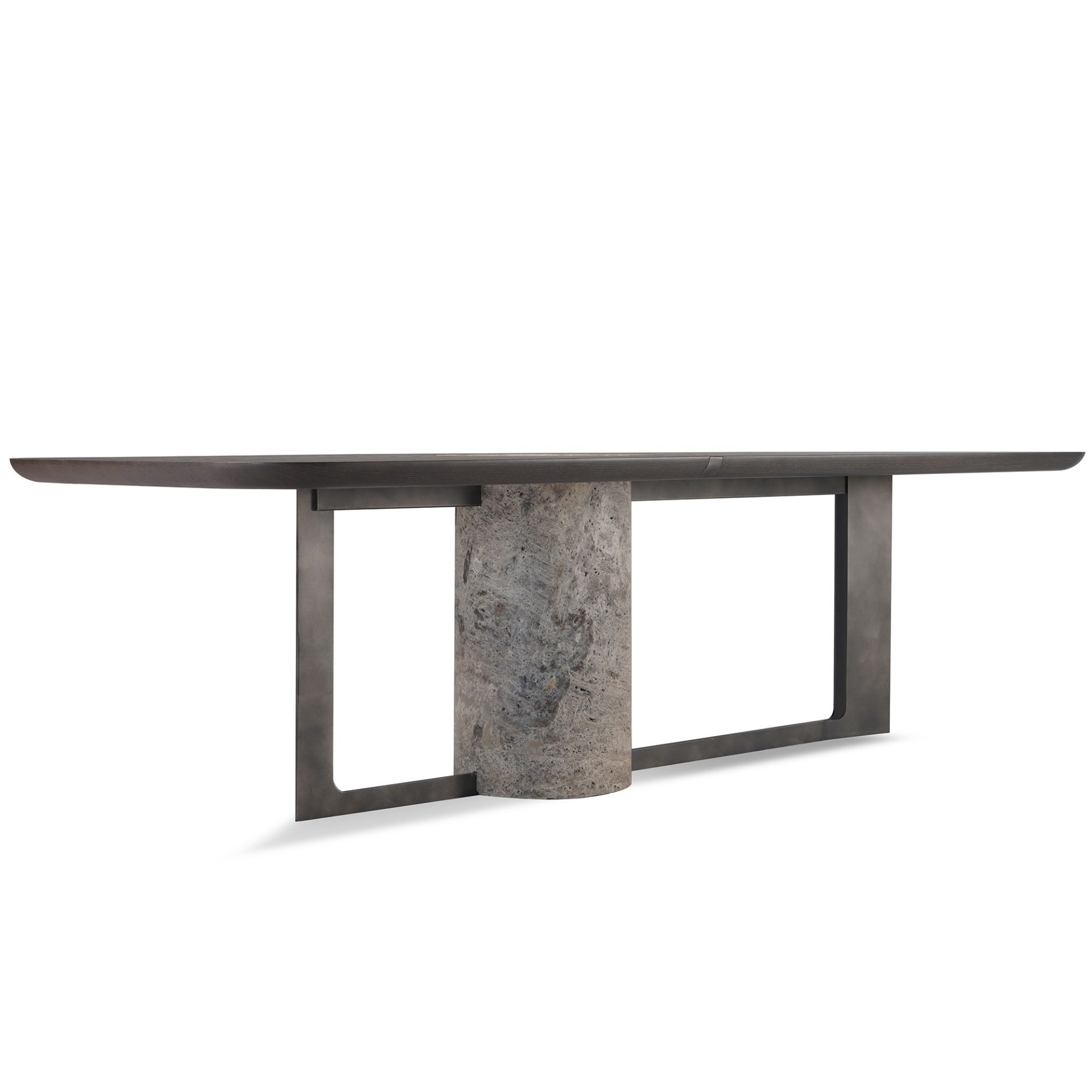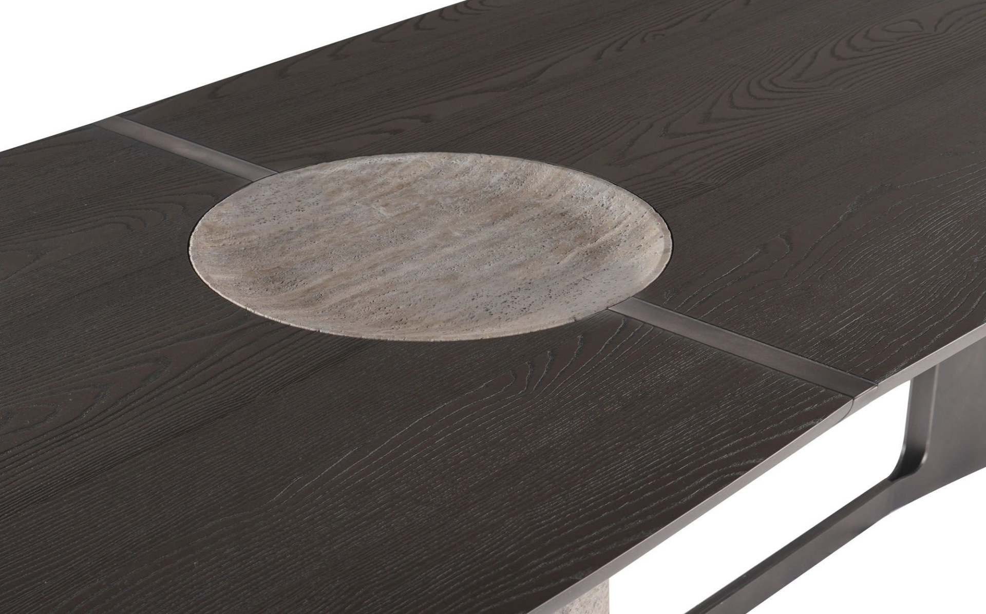Heykelsi duruşu, şaşırtıcı detaylarıyla göze çarpan ve Titano serisinin neşeli doğasını yansıtan Titano Masa’ nın masif ahşap tablası, farklı uzunluklara sahip iki parçadan oluşuyor ve bu parçalar doğal taş sütun ayağın etrafında birleşiyor. Bağlantı detayı, masayı kurdele gibi saran incecik, zarif bir metal kayışın ardına saklanırken, masa tablasına ek destek olarak işlevlenen metal ayak tüm üniteyi çerçeveye alıyor. Taş sütunun ahşap tablayla hem yüz olan üst noktasındaki oyuk, kompozisyonu estetik ve işlevsel açıdan zenginleştiren bir detay. Tüm malzemeler yerel. Sütun ayak, traverten ve mermer seçeneklerine, kumlanmış masif ahşap ve metal yüzeyler ise çok sayıda renk alternatifine sahip.
