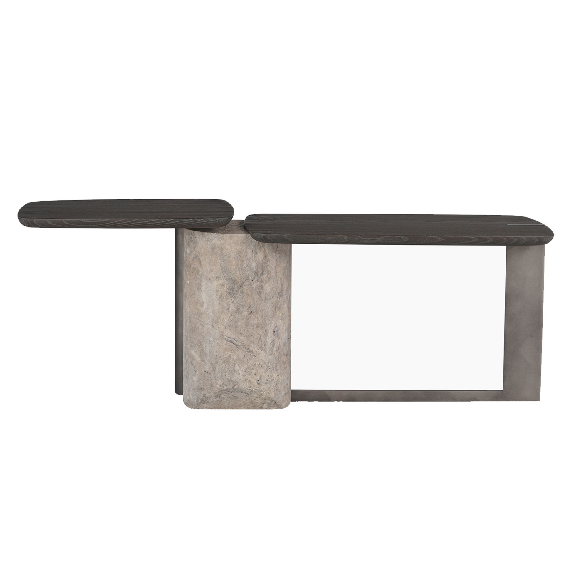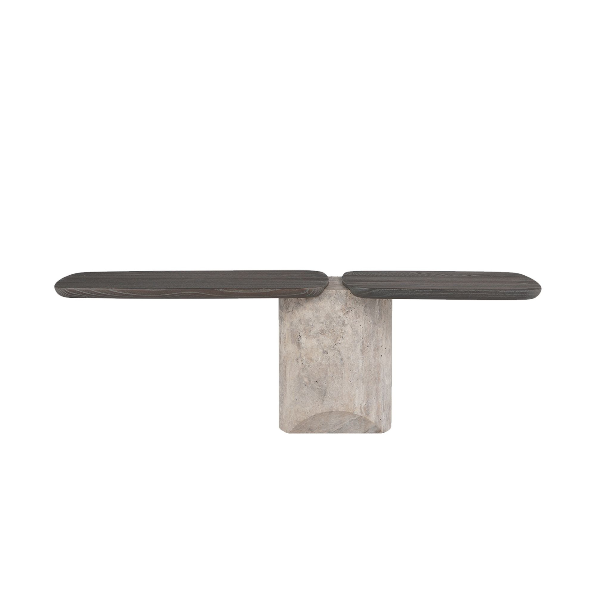 İç mekânda tek başına odak noktası yaratabilecek güçteki tasarım diliyle dikkat çeken Titano Sehpa, farklı gereksinimlere ve tercihlere uyum gösterecek iki alternatif form ve boyutta üretiliyor. Titano Sehpa A, kanatları açılmış, uçmaya hazırlanan bir kuşun kavramsal bir yorumu niteliğinde, hafiflik duygusu veren bir ürün. Kenarları yuvarlatılmış masif ahşap tablalar, doğal taş sütunun tepesindeki oyuklara tutunarak, ürünün asimetrik, heykelsi özünü ortaya koyuyor. Titano Sehpa B, masif ahşap tablaları desteklemek için tamamlayıcı metal ayaklarla donatılmış, zemine basan bir tasarım. İnce metal şerit ayak, uzun ahşap tablayı alttan desteklerken taş sütunla birleşen metal bir boru, diğer tablayı bir kademe yükseğe taşıyarak iki yüzey arasında kot farkı yaratılmasına imkân tanıyor. Tüm malzemeler yerel üreticilerden temin ediliyor. Taş sütun ayak, traverten ve mermer seçeneklerine, kumlanmış masif ahşap tablalar ve metal yüzeyler çok sayıda renk alternatifine sahip.